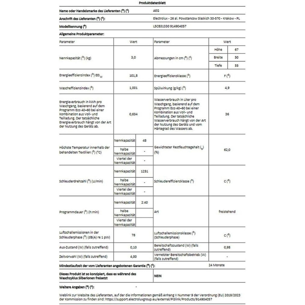 | Energieverbrauch Waschen: | 63 kWh / 100 Zyklen |