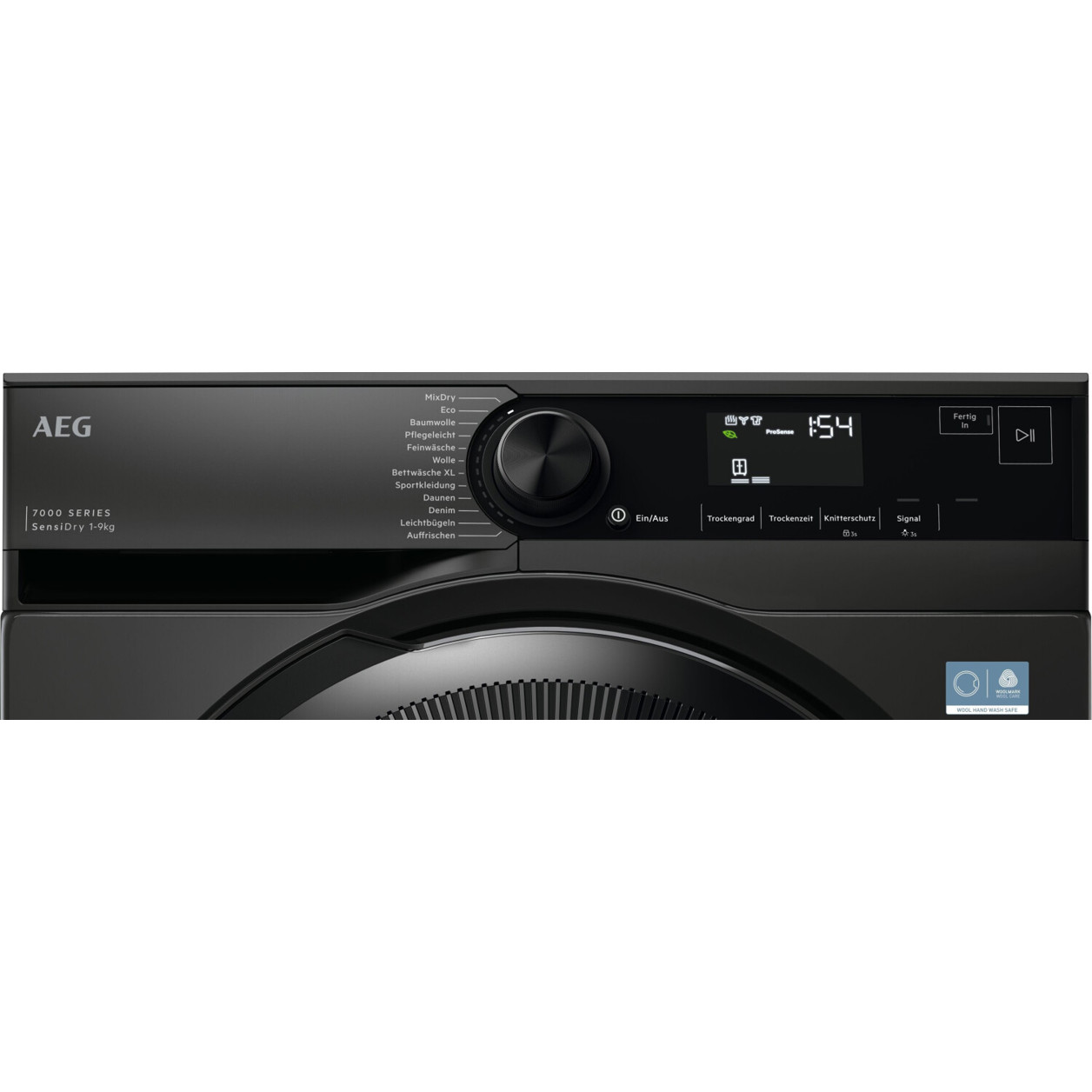 | Displayanzeigen: | Restzeit, Programmablaufstatus, Wärmetauscher, Filterreinigung, Kondenswasserbehälterleerung |