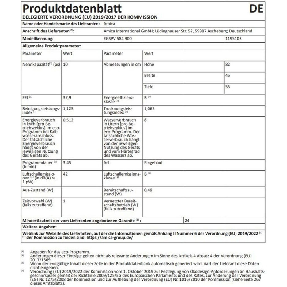 Amica EGSPV 584 Geschirrspüler - 900 Watt