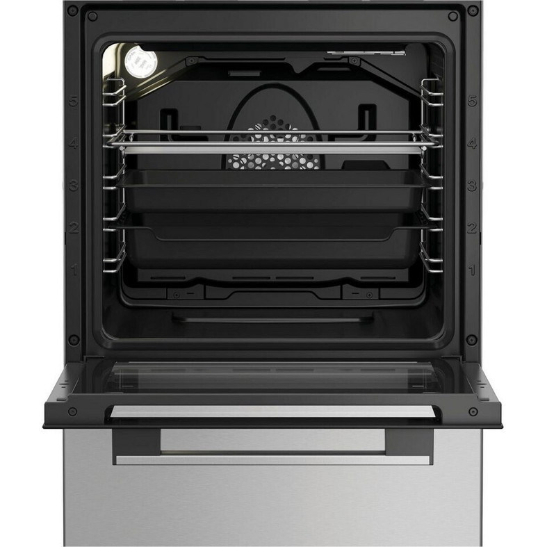 Der Innenraum bietet ein Volumen von 60 Litern, ideal für die Zubereitung von großen Mahlzeiten. Während der konventionelle Energieverbrauch bei nur 0,92 kWh liegt, benötigen Sie für die Heißluft/Umluft-Funktion lediglich 0,76 kWh. Der Gesamtanschlusswert beträgt 7.900 W.