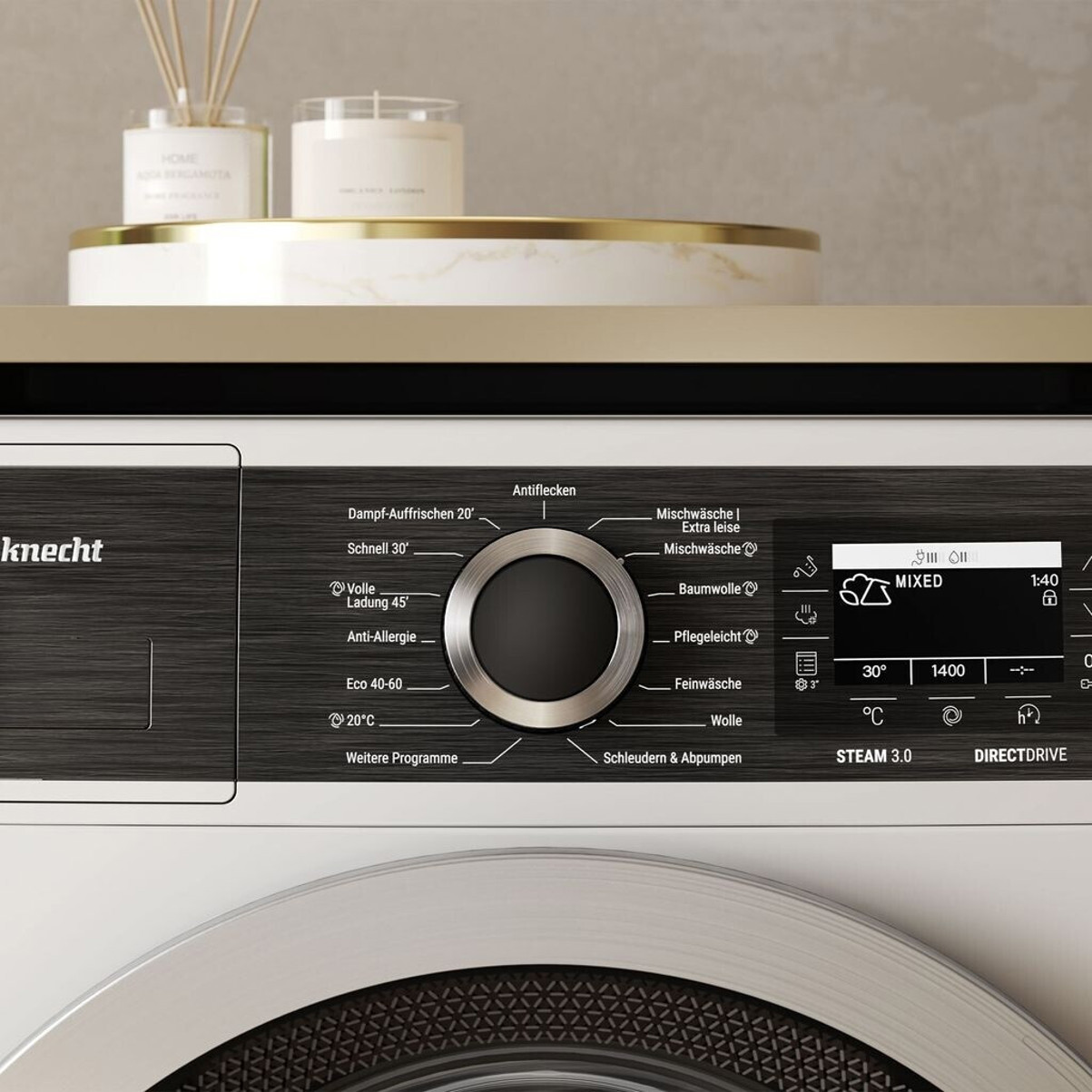 Die innovative Einsparungstechnologie gewährleistet einen Wasserverbrauch von nur 43 Litern pro Zyklus, während der Direktantrieb für eine langlebige und effiziente Leistung sorgt.