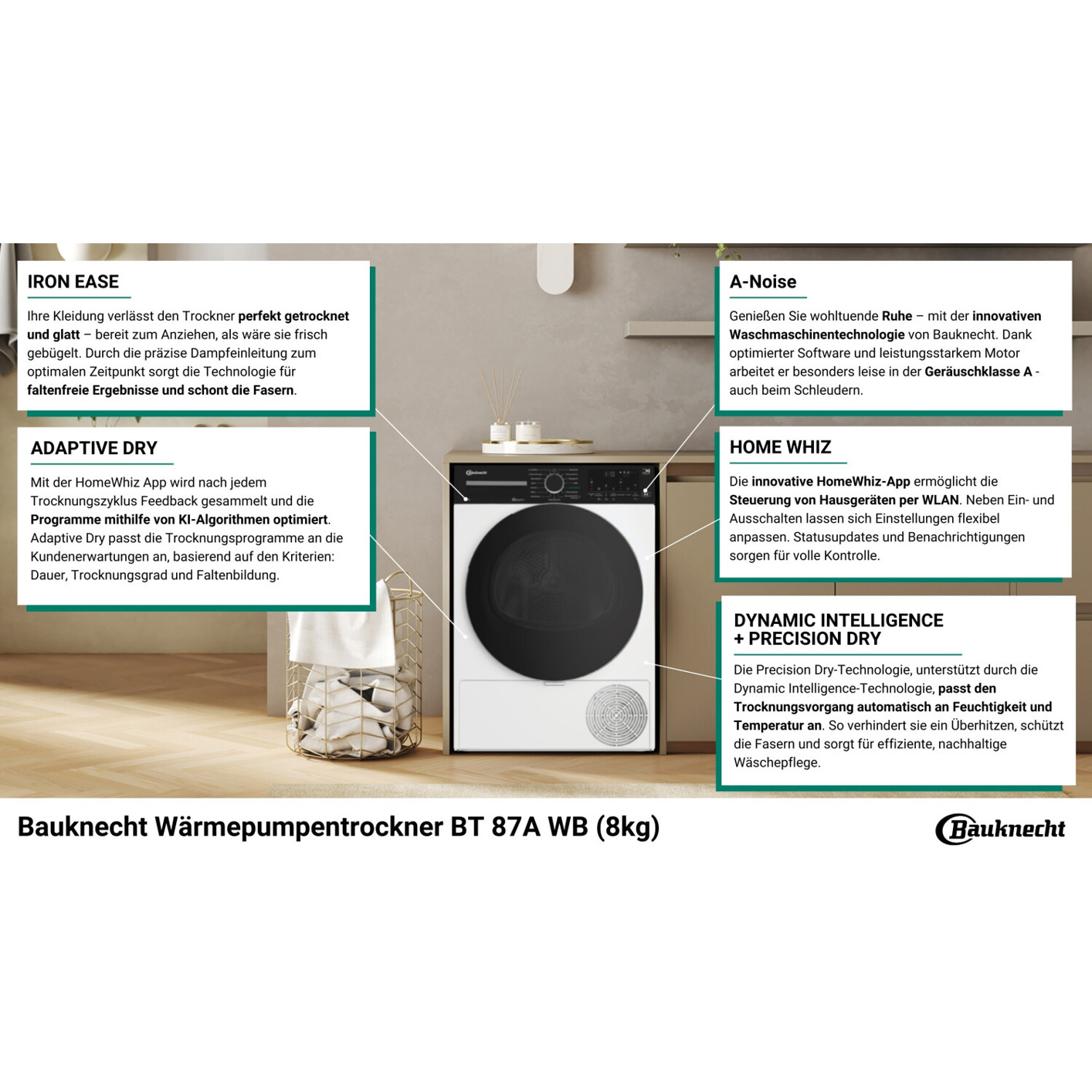 Erleben Sie die Vorteile der Smart-Home-Kompatibilität mit KI-Unterstützung und App-Steuerung über die HomeWhiz-App. Das robuste Innenleben aus Edelstahl und die Innenbeleuchtung der Trommel ergänzen die Qualität des Bauknecht BT 87A WB.