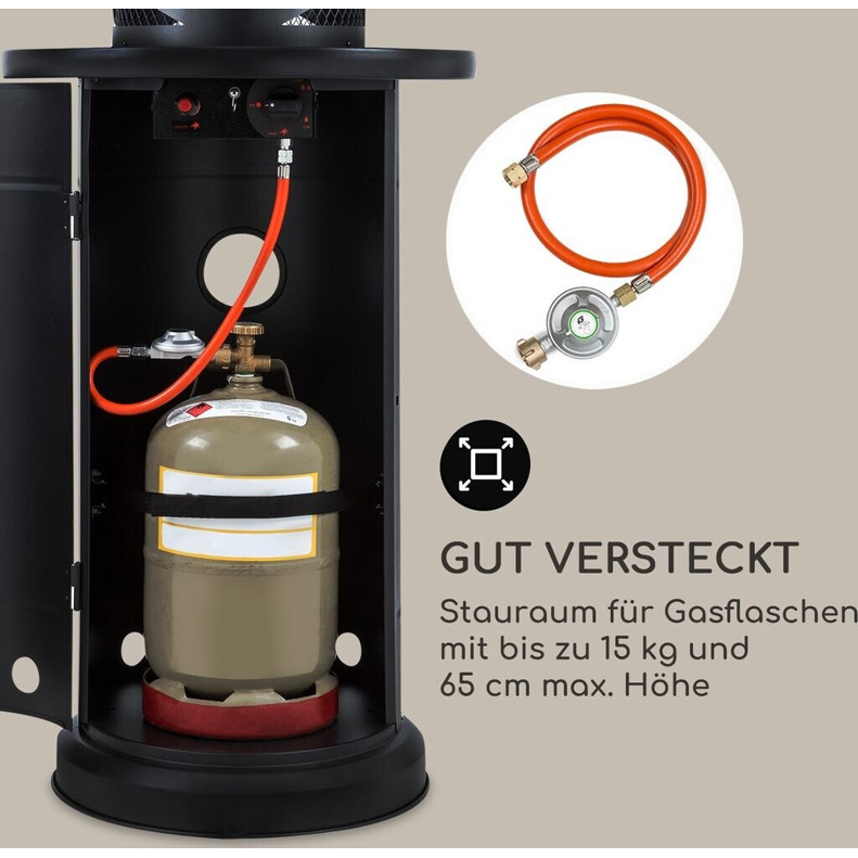 Mit einem Gewicht von 19 kg ist der Heizstrahler zwar stabil, jedoch ermöglichen die praktischen Transportrollen eine mühelose Bewegung. Dank der elektrischen Zündung und dem Druckminderer ist der Einsatz einfach und sicher. Er eignet sich für Gasflaschen bis 15 kg und hat einen Gasverbrauch von 815 g/h.