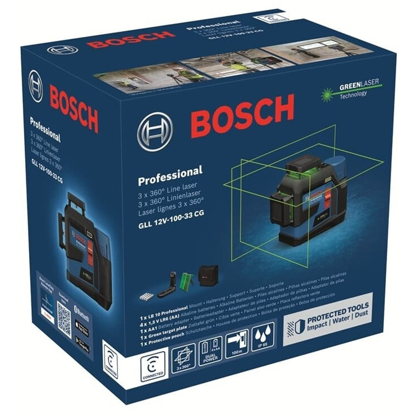Der GLL 12V-100-33 CG ist nach IP 65 geschützt, was bedeutet, dass er staubdicht und spritzwassergeschützt ist – perfekt für den Einsatz sowohl drinnen als auch draußen. Mit einer Laserklasse von 2 und einer Linienfarbe in leuchtendem Grün sorgt er für eine optimale Sichtbarkeit und Genauigkeit.