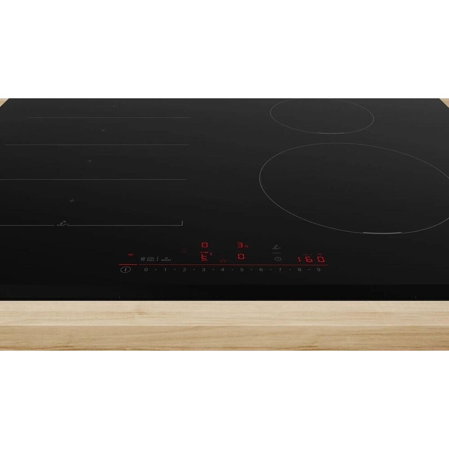 Entdecken Sie das elegante und leistungsstarke Bosch PIX631HC1E Induktionskochfeld in schwarzer Glaskeramik. Mit seiner flächenbündigen Bauweise ohne Rahmen fügt es sich nahtlos in jede moderne Küche ein.