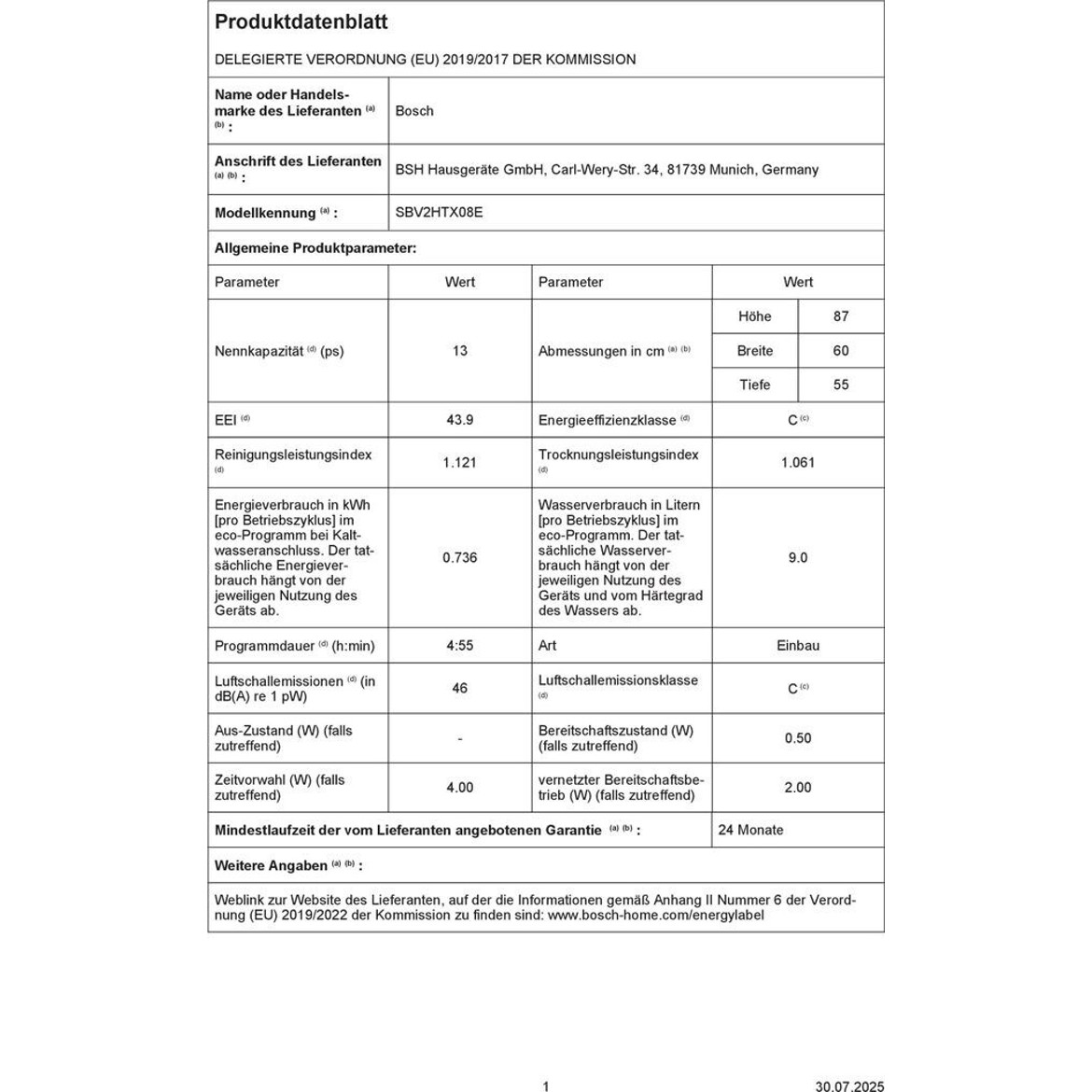 Ausgestattet mit einem bürstenlosen Motor, überzeugt der Bosch SBV2HTX08E durch seine Energieeffizienzklasse B und einen durchschnittlichen Stromverbrauch von nur 25,87 Euro pro Jahr bei einem Verbrauch von 74 kWh je 100 Zyklen im Eco-Programm. Beachten Sie, dass der tatsächliche Verbrauch von der Art und Häufigkeit der Nutzung abhängt.