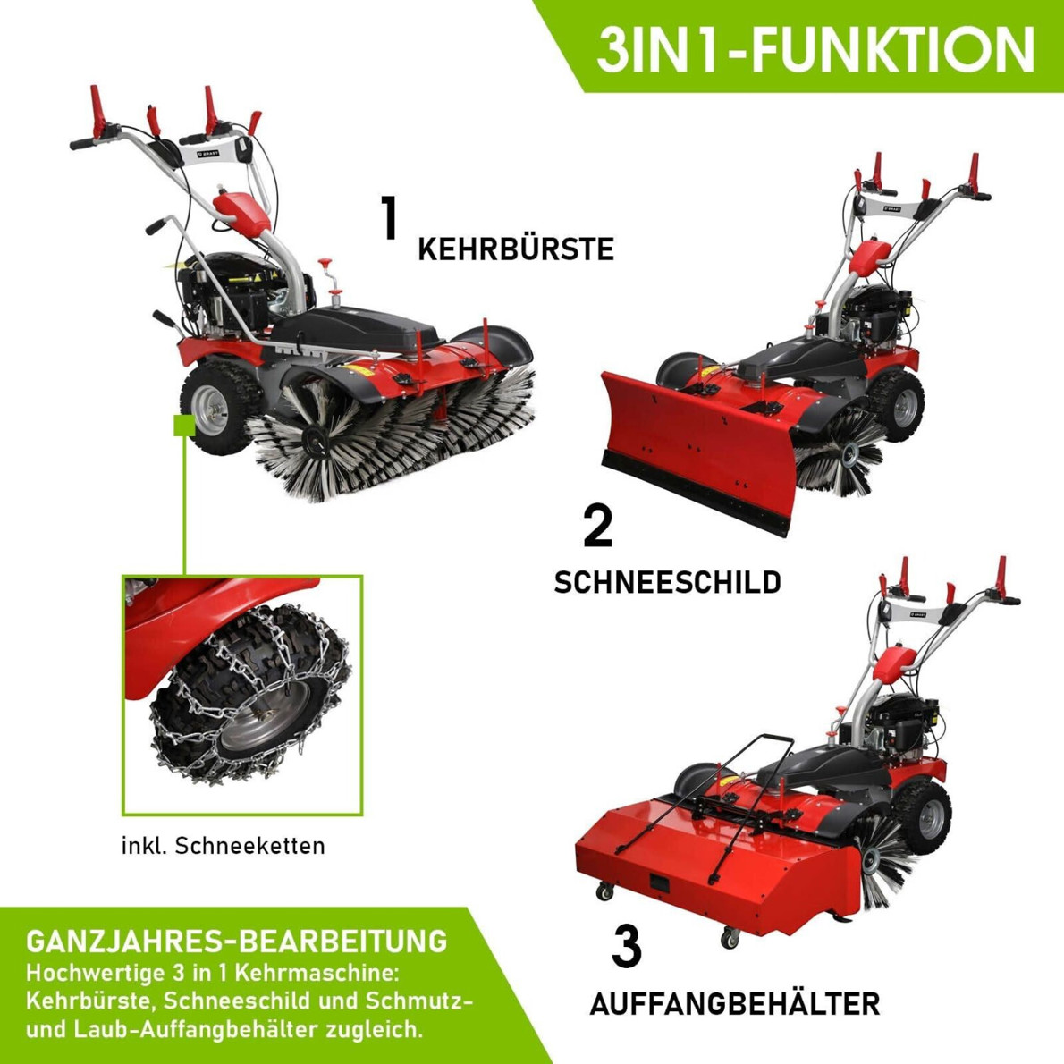 Im Lieferumfang enthalten sind eine Kehrbürste, ein Schneeschild und ein Laubsammler, sodass Sie die Kehrmaschine für verschiedene Anwendungen nutzen können. Egal ob winterliche Schneeräumung oder die Entfernung von Laub im Herbst, diese Kehrmaschine ist Ihr zuverlässiger Partner für jede Jahreszeit.