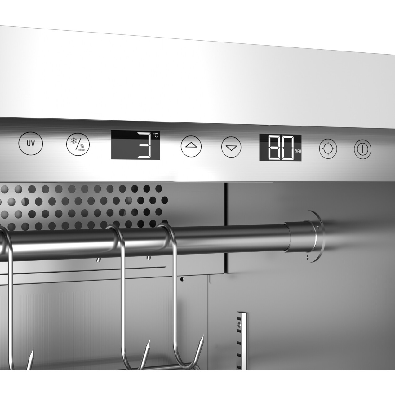 Der Innenraum ist nicht nur beleuchtet, sondern verfügt auch über ein Schloss für zusätzlichen Schutz. Die antibakterielle UV-Lichttechnologie sorgt dafür, dass Ihr Fleisch in einer gesunden Umgebung reift, während die Luftfeuchtigkeit zwischen 50 und 85 % gesteuert werden kann, um die optimalen Bedingungen für die Reifung zu gewährleisten.