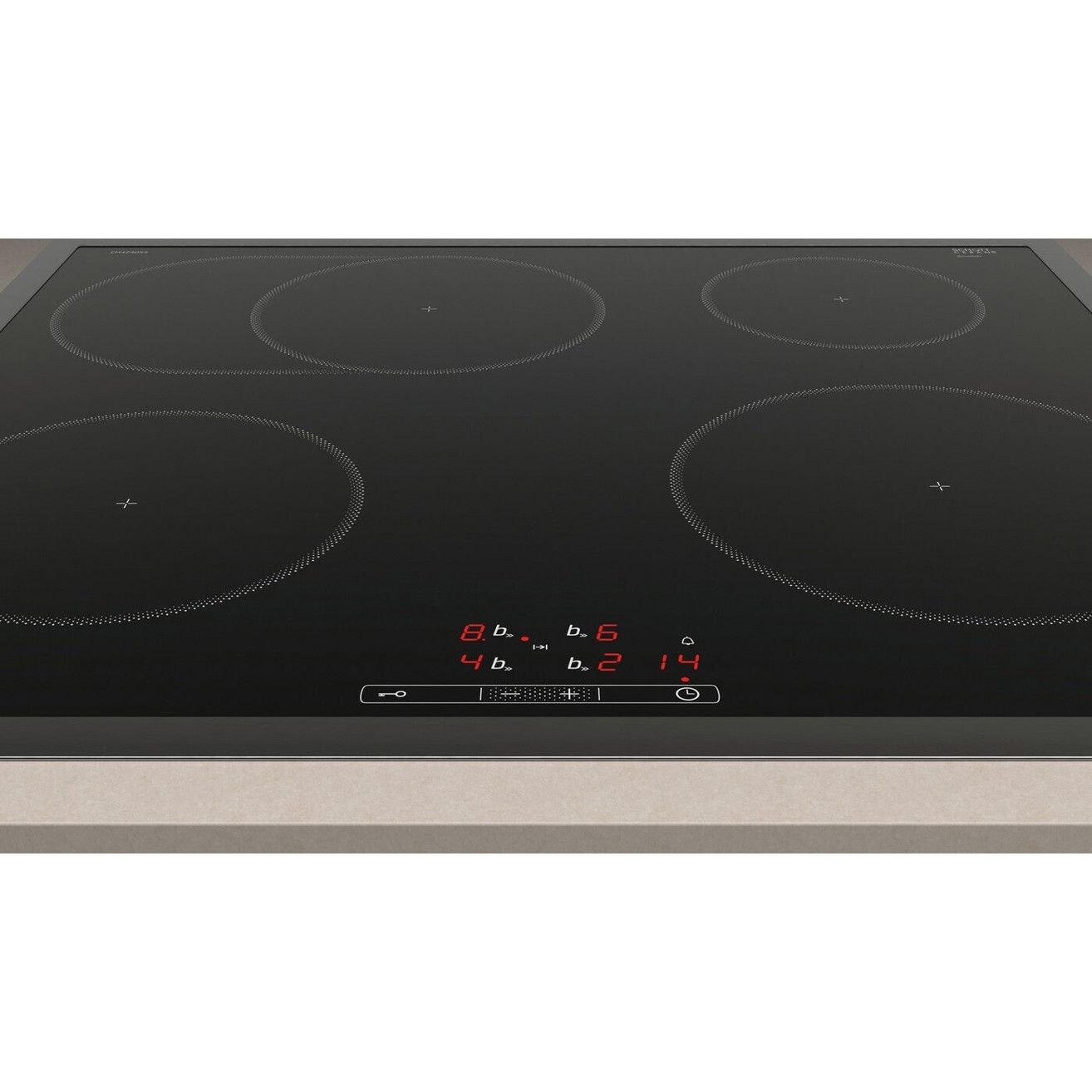 Das Elektrokochfeld mit 4 Ceran-Kochzonen und einer Bräterzone ermöglicht Ihnen eine flexible Nutzung. Die Bedienelemente am Kochfeld sind intuitiv gestaltet mit Drehschaltern und zusätzlichen Tasten, sodass Sie bequem alle Funktionen steuern können. Für zusätzliche Sicherheit sorgt die Kindersicherung, die Kühlgebläse und die Nachlaufautomatik.