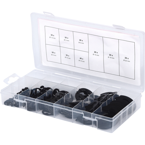Erleben Sie eine umfassende Auswahl an E-Sicherungsringen, die in verschiedenen Durchmessern von 1,6 bis 19,1 mm erhältlich sind. Dieses Sortiment umfasst insgesamt 300 Teile und ist gemäß der Norm DIN 6799 gefertigt, sodass Sie sich auf höchste Qualität und Präzision verlassen können.