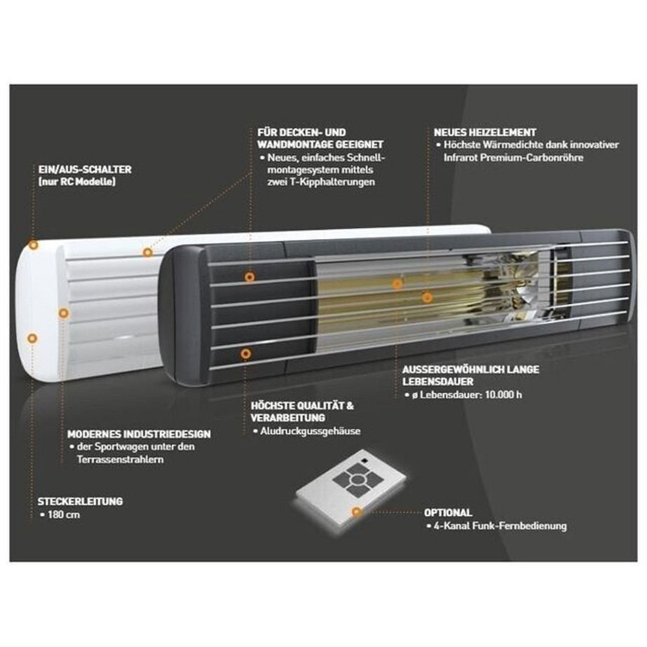 Entdecken Sie den Etherma Infrarotstrahler ETEXOPRO2000RCB, ein leistungsstarker und effizienter Infrarotstrahler, der Ihren Raum in kürzester Zeit in eine wohlige Wärme hüllt. Gefertigt aus hochwertigem Aluminium, bietet dieses Gerät nicht nur eine ansprechende Optik, sondern auch eine langlebige und robuste Bauweise.