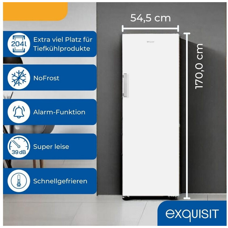 Entdecken Sie den Exquisit GS5271-NF-H-040E in ansprechendem weiß, der perfekt in jede moderne Küche passt. Mit einer Höhe von 170 cm und einem großzügigen Gefrierinhalt von 204 Litern bietet dieser freistehende Standgefrierschrank ausreichend Platz für Ihre gefrorenen Lebensmittel.