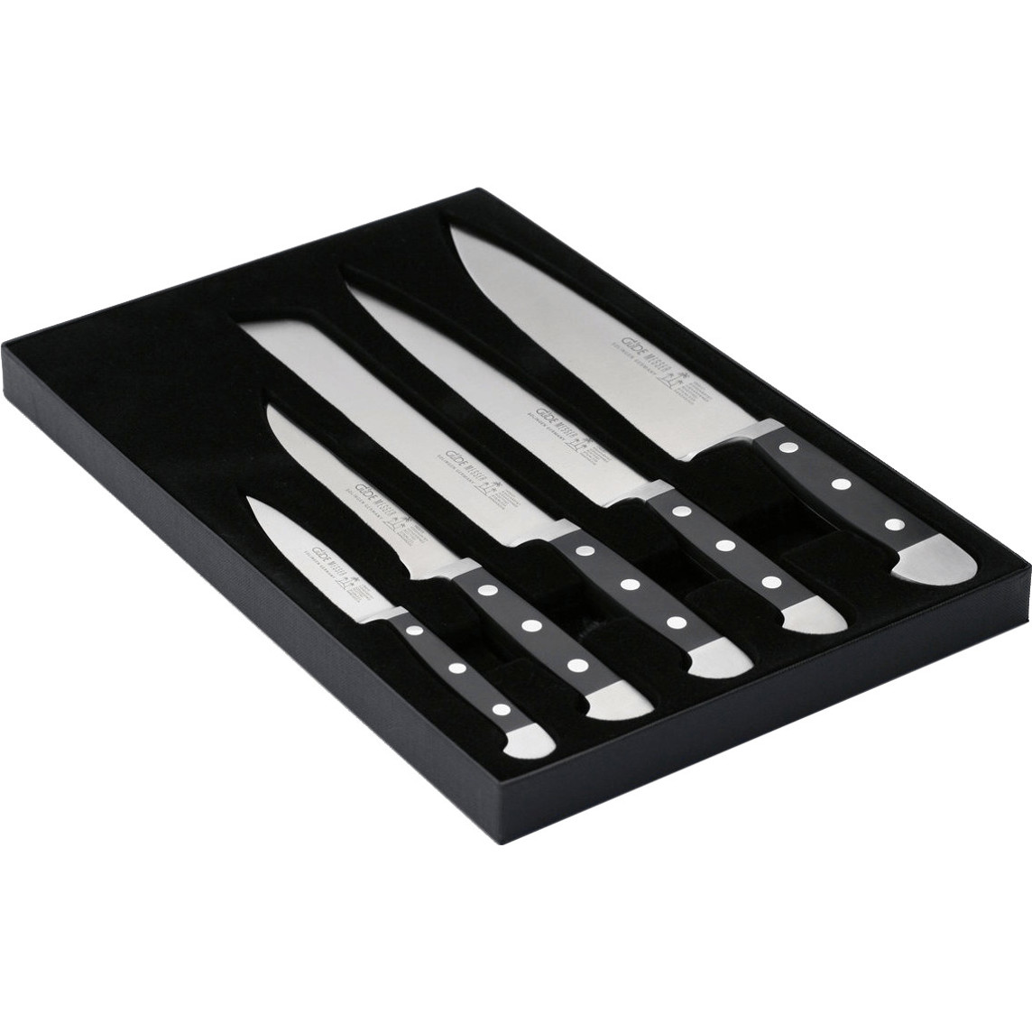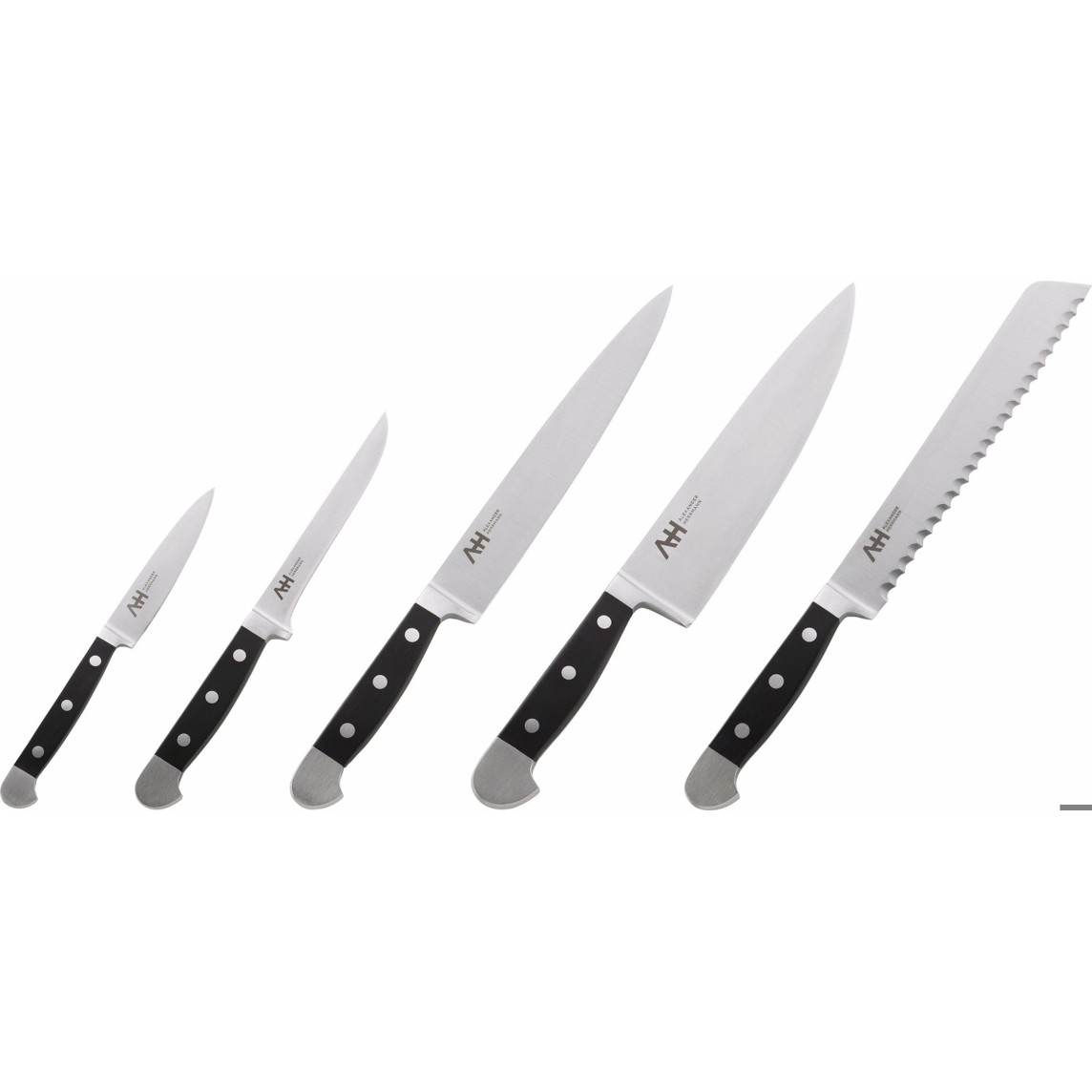 | bestehend aus: | Spickmesser 10 cm, Schinkenmesser 21 cm, Kochmesser 21 cm, Brotmesser 21 cm, Ausbeinmesser 13 cm |