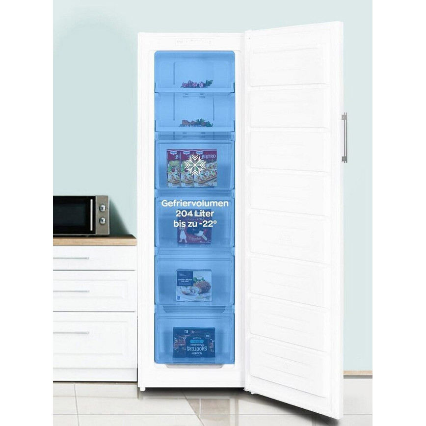 Der No-Frost-Kühlsystem verhindert die Bildung von Eis, wodurch Sie sich keine Sorgen um das Abtauen machen müssen. Mit 204 Litern Inhalt und 5 Gefriergutschubladen, einschließlich der praktischen BigBox, bietet er ausreichend Platz für größere Vorräte - perfekt für Haushalte mit 2 Personen oder mehr.
