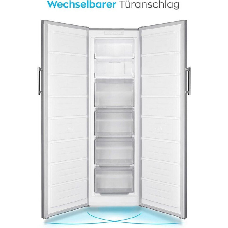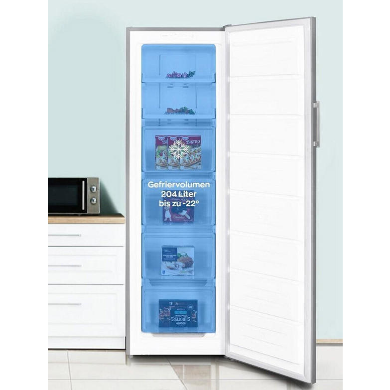 Die Maße des Gefrierschranks sind optimal durchdacht: Er weist eine Höhe von 170,5 cm, eine Breite von 54,5 cm und eine Tiefe von 60 cm auf, wodurch er perfekt in viele Küchen passt. Der Türanschlag ist wechselbar, was zusätzliche Flexibilität bei der Positionierung bietet.