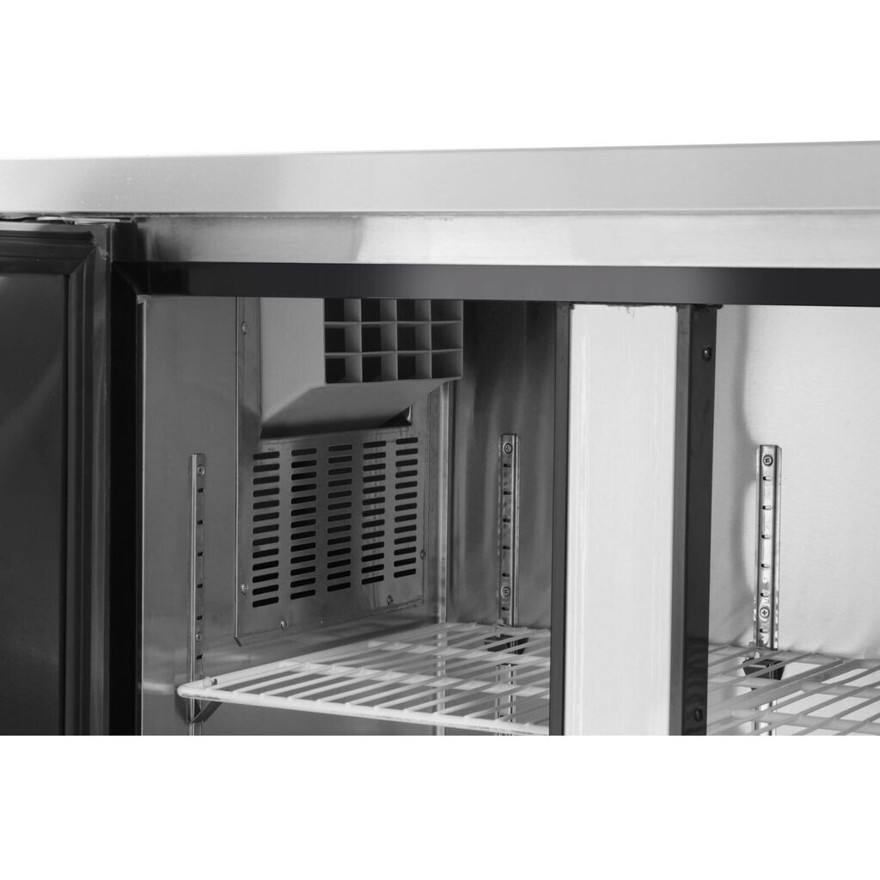 Der Kühltisch verfügt über ein effektives Umluftkühlsystem, das eine gleichmäßige Kühlung gewährleistet und so ideale Bedingungen für die Lagerung Ihrer Lebensmittel schafft. Mit einem großzügigen Innenraum von 390 Litern und zahlreichen Abstellflächen bietet er ausreichend Platz, um Ihre Zutaten stets griffbereit zu haben.