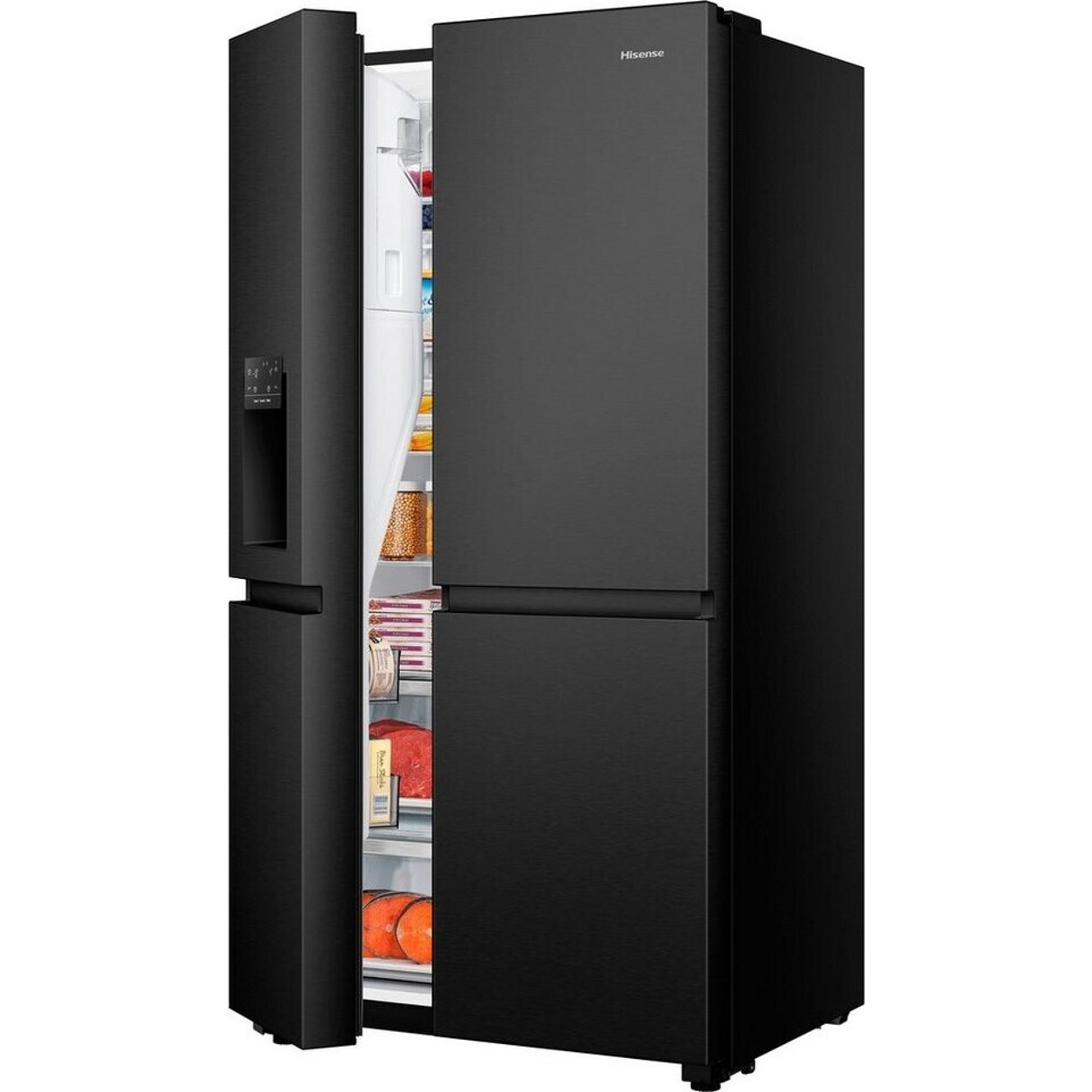 Entdecken Sie den Hisense RS818N4TFE, einen eleganten und leistungsstarken Side-by-Side-Kühlschrank in modernem schwarz. Mit einem großzügigen Fassungsvermögen von 632 Litern, verteilt auf den Kühlbereich mit 417 Litern und den Gefrierbereich mit 215 Litern, bietet er ausreichend Platz für die Bedürfnisse der ganzen Familie.