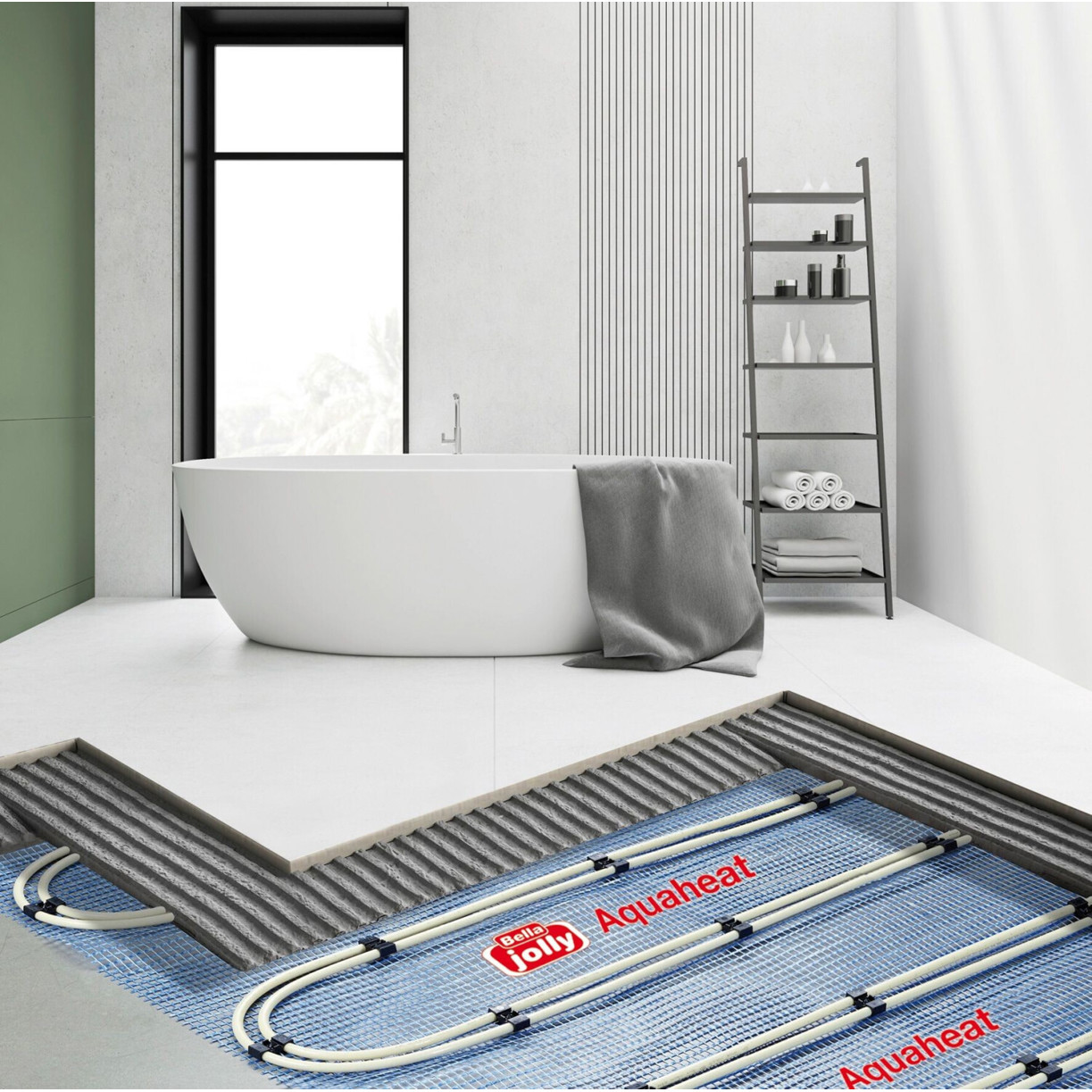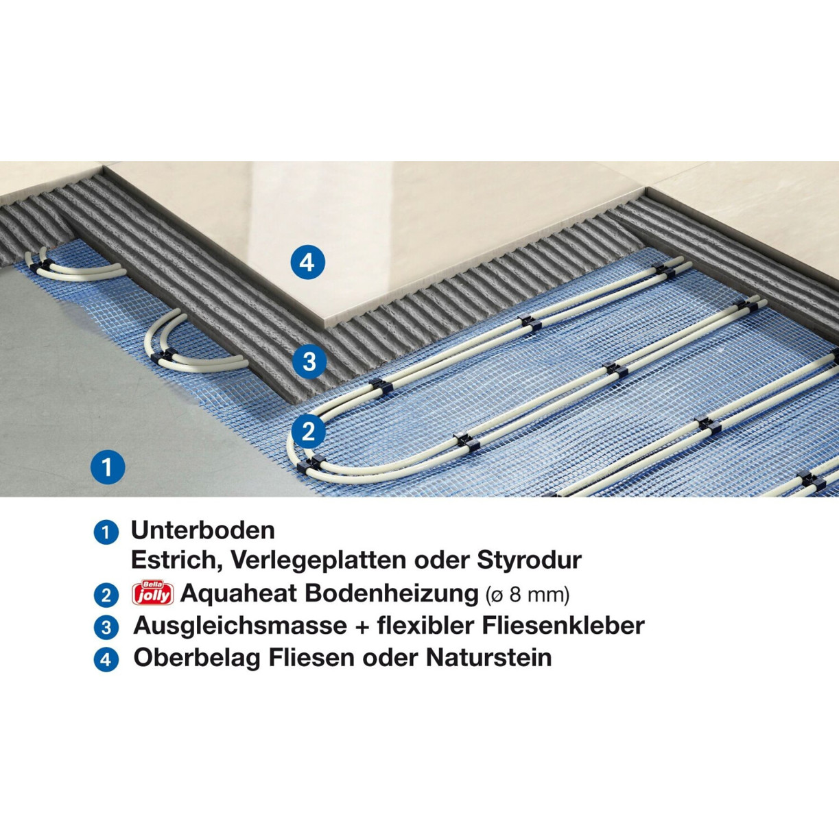 Erleben Sie die wohltuende Wärme mit der Jollytherm Heizmatte Aquaheat. Diese innovative Warmwasser-Fußbodenheizung bietet eine effiziente Leistung von 100 Watt/m² und ist ideal für eine Fläche von 10 m². Mit einer Breite von 0,8 m lässt sie sich problemlos in verschiedenen Räumlichkeiten integrieren.