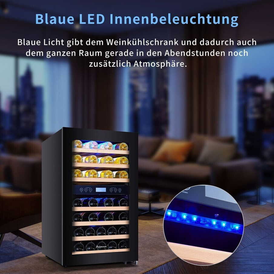 Dieser 2-Zonen-Weinkühlschrank bietet Ihnen die ideale Lagermöglichkeit für bis zu 45 Flaschen (á 0,75 l) und sorgt bei einem Temperaturbereich von 5-18 °C für die optimale Reifung Ihres Weins. Mit 6 herausnehmbaren Holzlagerböden können Sie die Innenraumgestaltung flexibel anpassen. Der große Nutzinhalt von 120 Litern macht ihn zur perfekten Wahl für Weinliebhaber.