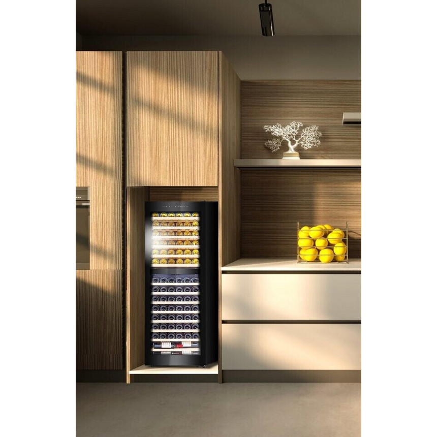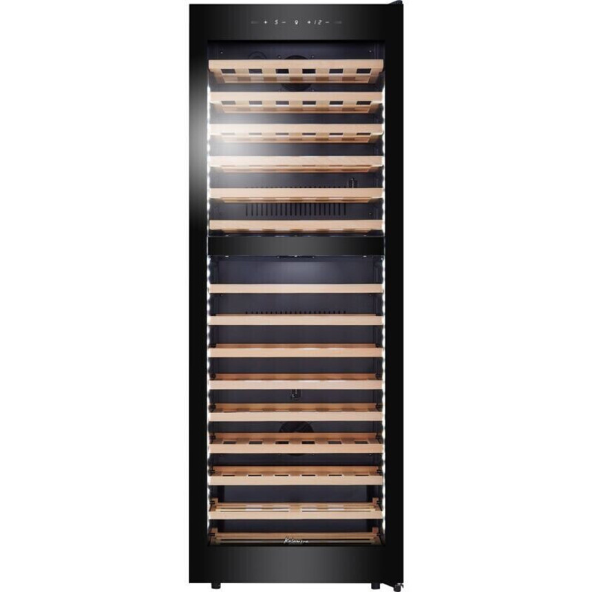 Entdecken Sie den eleganten Kalamera KRC-266BFG, ein hochwertiger Weintemperierschrank in klassischem Schwarz, der Ihren Wein perfekt lagert. Mit einem großzügigen Nutzinhalt von 266 Litern bietet er Platz für bis zu 84 Flaschen (0,75 l) auf 15 herausnehmbaren Holzlagerböden.
