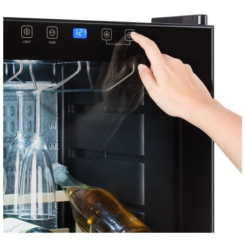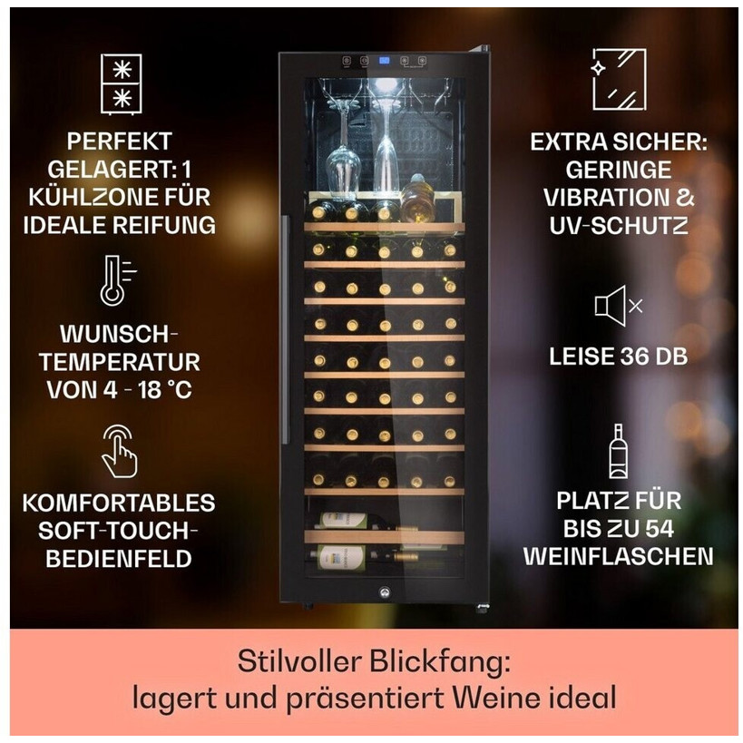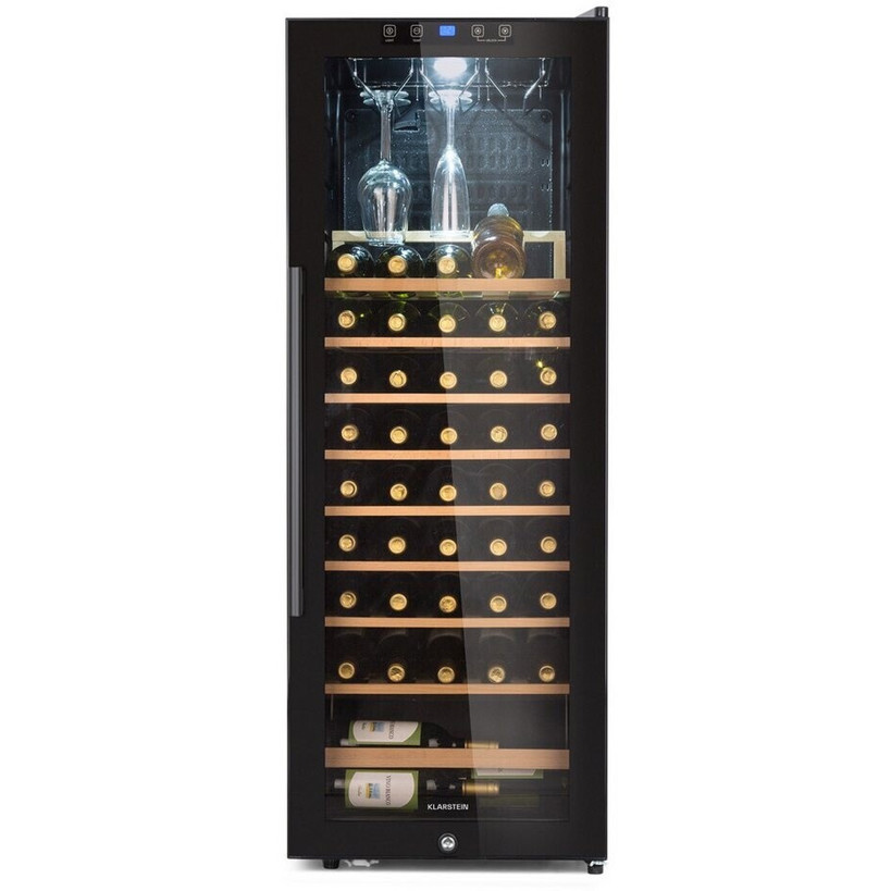 Entdecken Sie den Klarstein Barossa 54 Duo Weinkühlschrank in elegantem Schwarz, der nicht nur durch sein stilvolles Design besticht, sondern auch durch seine durchdachte Funktionalität. Mit einer Breite von 48 cm und einer Höhe von 129,5 cm passt er perfekt in jede Ecke Ihres Wohnraums und bietet ausreichend Platz für bis zu 54 Flaschen mit einem Volumen von 0,75 l.