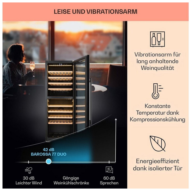 Die Temperatur im Innenraum lässt sich flexibel zwischen 5 und 20 °C einstellen, sodass Ihre Weine immer die idealen Bedingungen erhalten. Zudem sorgt die integrierte Innenraumbeleuchtung mit LED-Technologie für eine ansprechende Präsentation. Mit einem Geräuschpegel von nur 41 dB(A) arbeitet das Gerät nahezu lautlos und ist somit perfekt für jeden Wohnraum.