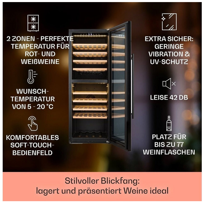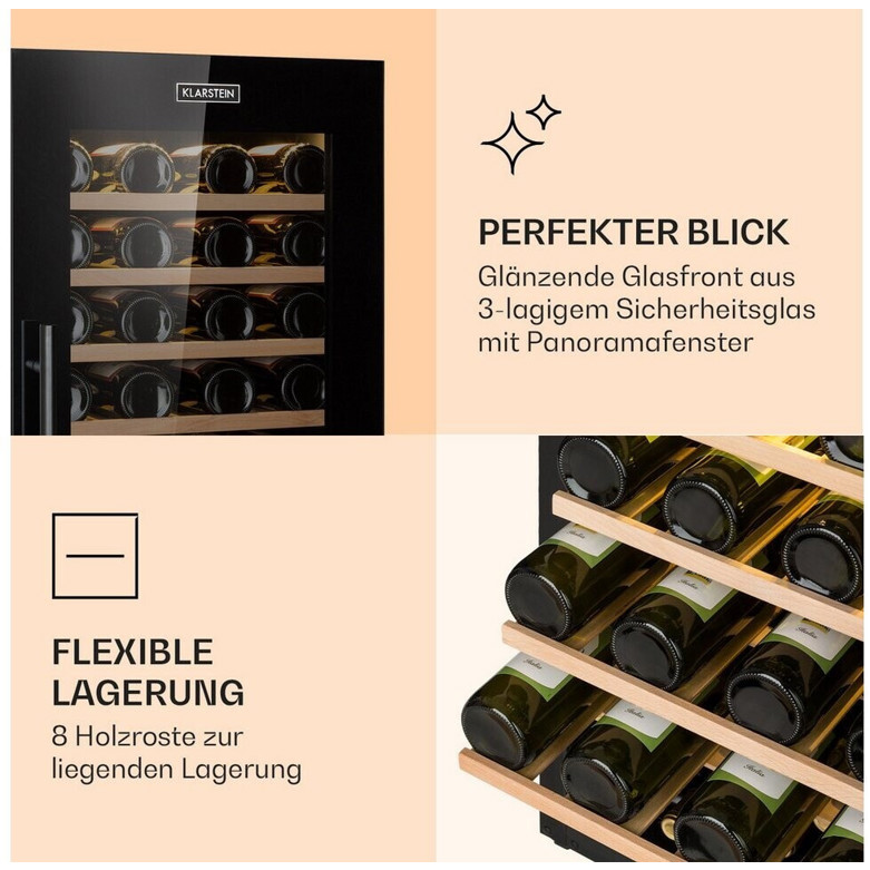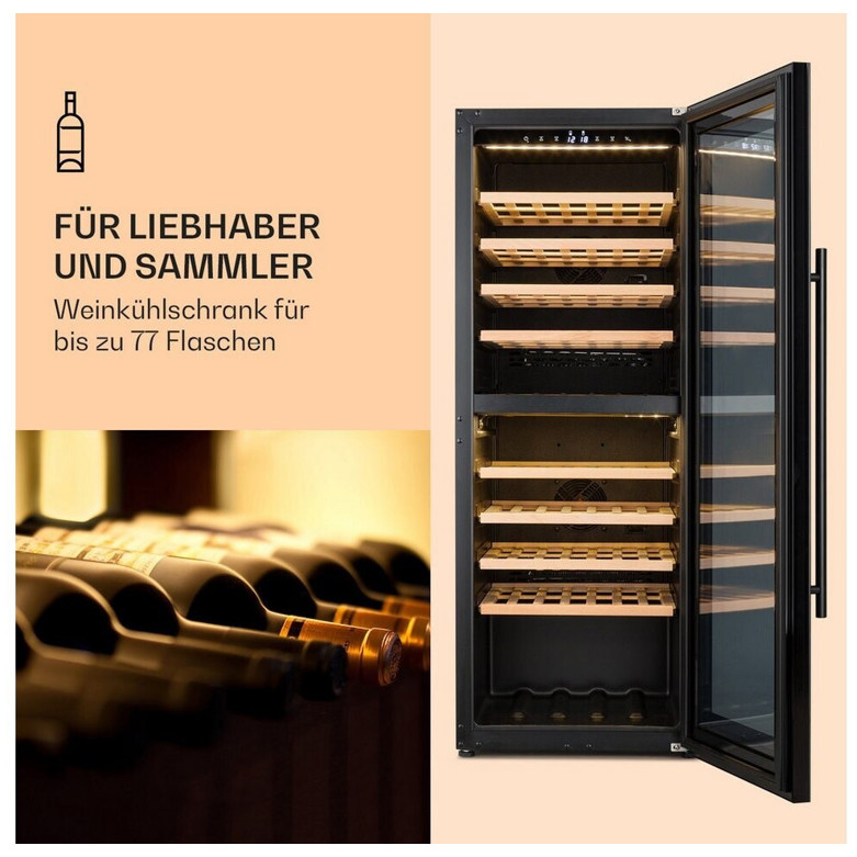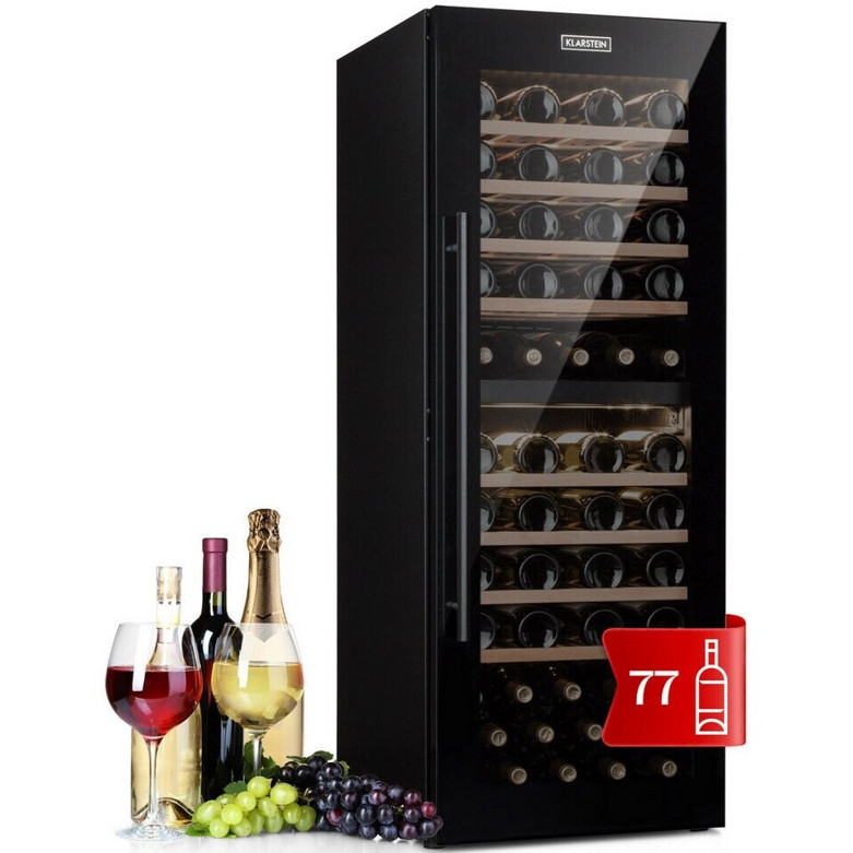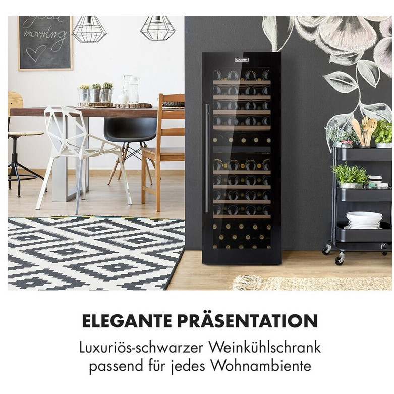 Genießen Sie Ihre Weine auf die perfekte Temperatur mit dem Klarstein Barossa 77 Duo Weinkühlschrank. Er besticht durch sein elegantes, schwarzes Design und bietet Platz für bis zu 77 Flaschen (á 0,75 l) auf stabilen Holzlagerböden.