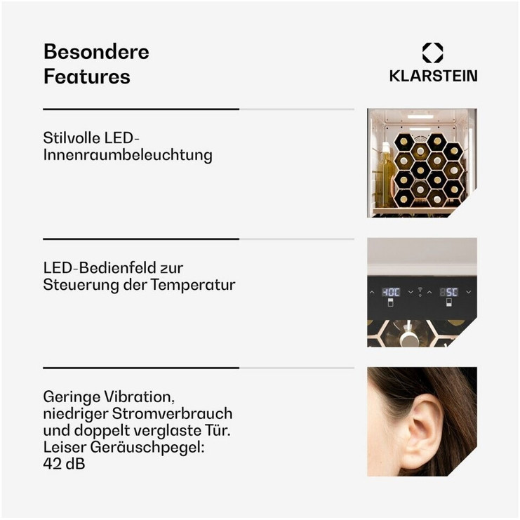 Der Shirley Cooler verfügt über zwei Temperaturzonen, die eine optimale Lagerung verschiedener Weinsorten ermöglichen. Mit einer Geräuschpegel von nur 42 dB(A) sorgt er dafür, dass die Umgebung ruhig bleibt – ideal für entspannte Abende mit Freunden. Die Holzlagerböden verleihen den 9 Flaschenborden nicht nur Stabilität, sondern auch eine ansprechende Optik, während die Innenraumbeleuchtung für eine elegante Präsentation Ihrer Weinsammlung sorgt.