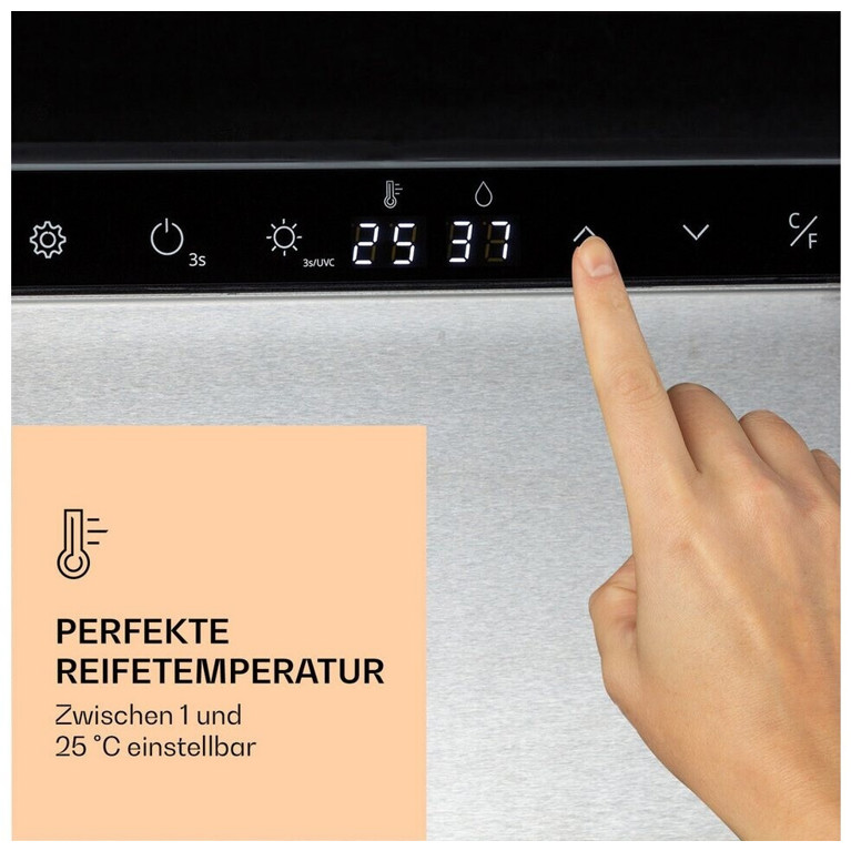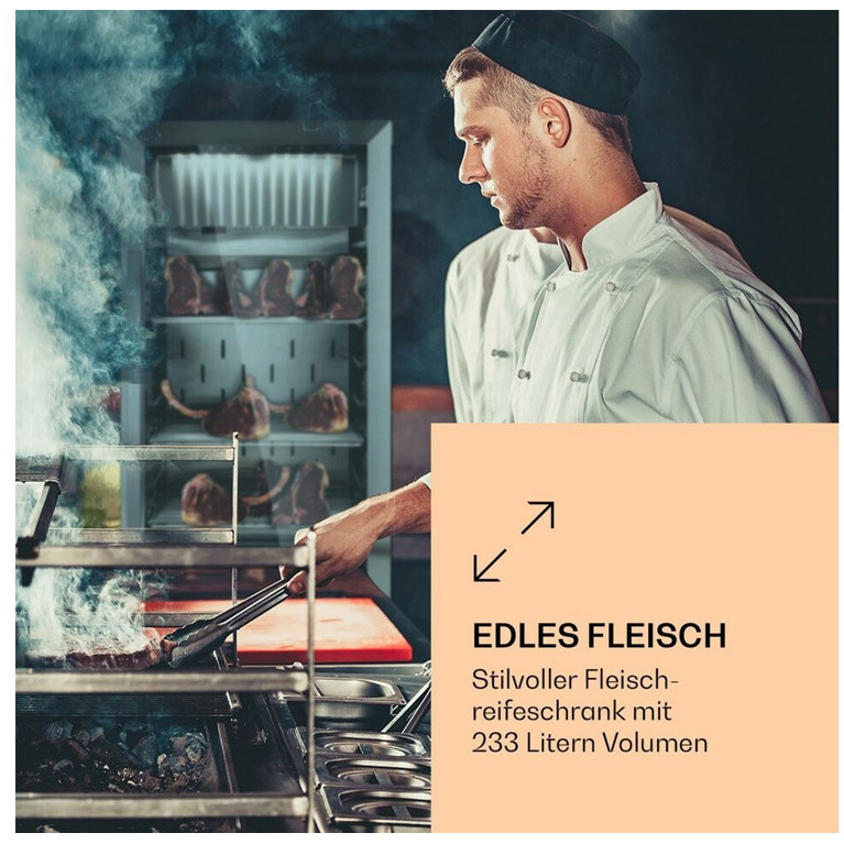 Das elegante Design mit Glastür ermöglicht es, Ihr hochwertiges Fleisch immer im Blick zu haben, während die elektronische Temperaturregelung sicherstellt, dass Sie die ideale Temperatur von 0 bis +25 °C für den Reifeprozess erreichen. Mit einem jährlichen Stromverbrauch von lediglich 803 kWh und einer Energieeffizienzklasse von B ist dieses Gerät zudem umweltfreundlich.