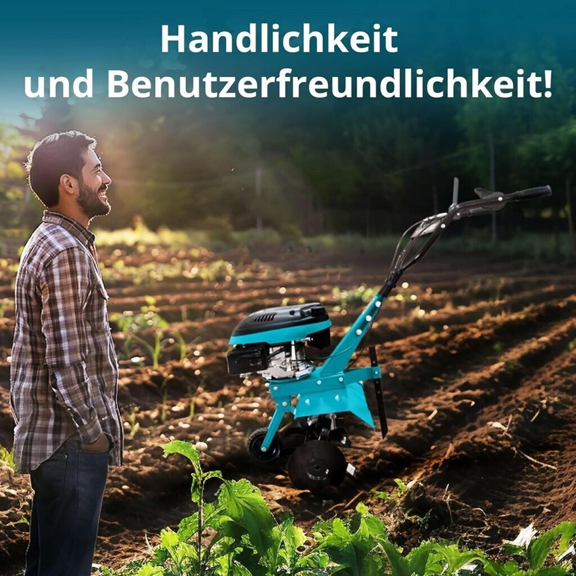 Der Tankinhalt von 1,5 Litern ermöglicht längere Betriebszeiten ohne häufiges Tanken, während der Öltank mit 0,6 Litern für die notwendige Schmierung sorgt. Mit einer Leistung von 4 PS bietet diese Motorhacke die notwendige Power, um auch härtesten Boden mit einer Arbeitsbreite von 70 cm und einer Arbeitstiefe von 27 cm zu bearbeiten.
