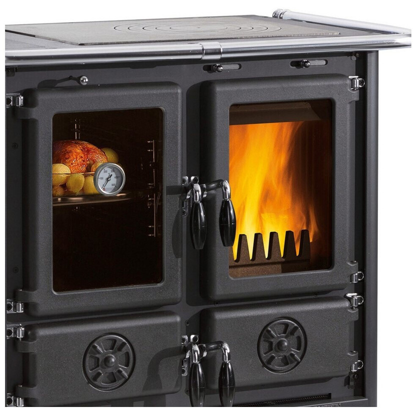 Zudem verfügt der La Nordica Rosetta Sinistra über eine Vielzahl von praktischen Ausstattungsmerkmalen, darunter eine Scheibenspülung, ein Thermometer, ein Rüttelrost, ein Aschebehälter, ein Schürhaken, ein geräumiger Backofen sowie ein Backblech. Die Abmessungen des Backofens betragen 30 x 25 x 38 cm und bieten genug Platz für Ihre kulinarischen Kreationen.