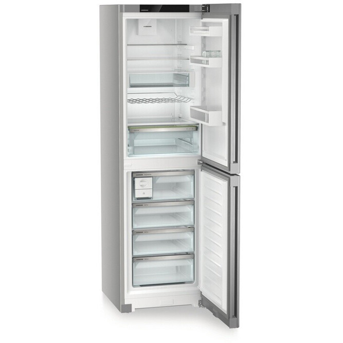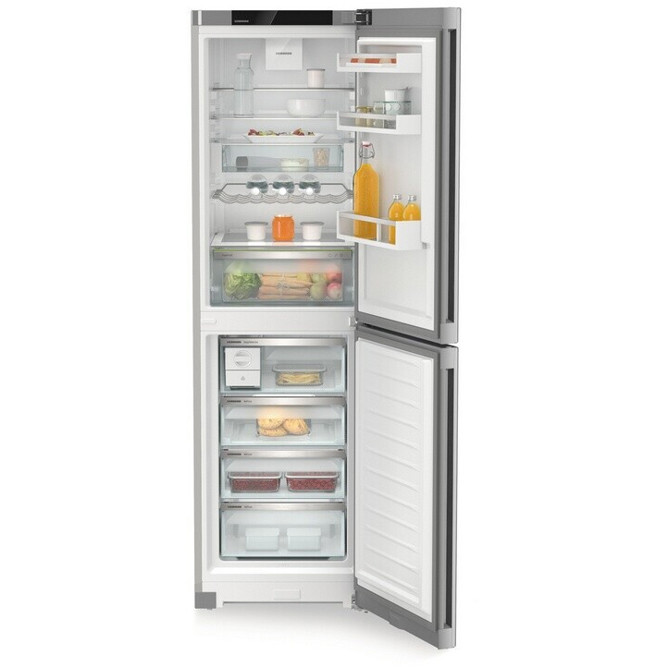 Die Liebherr CNsfc 573i-22 Kühl-Gefrierkombination in elegantem Silber kombiniert stilvolles Design mit modernster Technik. Mit einer Energieeffizienzklasse von C sorgt dieses freistehende Gerät für einen jährlichen Stromverbrauch von nur 168 kWh, was über 12 Jahre hinweg Kosten von ca. 613,20 Euro bedeutet. Ideal für Familien bietet diese Kombination ausreichend Platz mit einem Gesamtinhalt von 359 Litern, davon 227 Liter im Kühlbereich und 132 Liter im Gefrierbereich, der mit 4 Sternen ausgezeichnet ist und ein Gefriervermögen von bis zu 10 kg in 24 Stunden bietet.