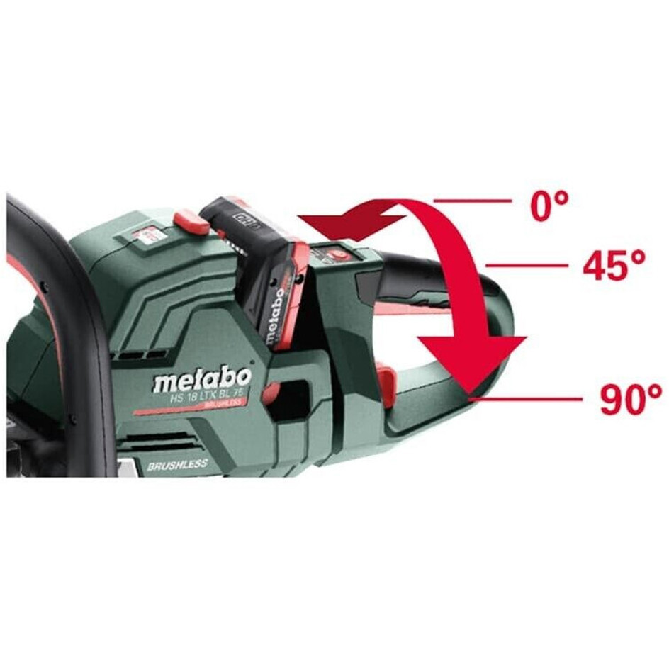 Die Metabo HS 18 LTX BL 75 ist mit diamantgeschliffenen Messern ausgestattet, die für einen sauberen Schnitt sorgen, während der drehbare hintere Handgriff eine ergonomische Handhabung ermöglicht. Der bürstenlose Motor garantiert eine lange Lebensdauer und hohe Effizienz.