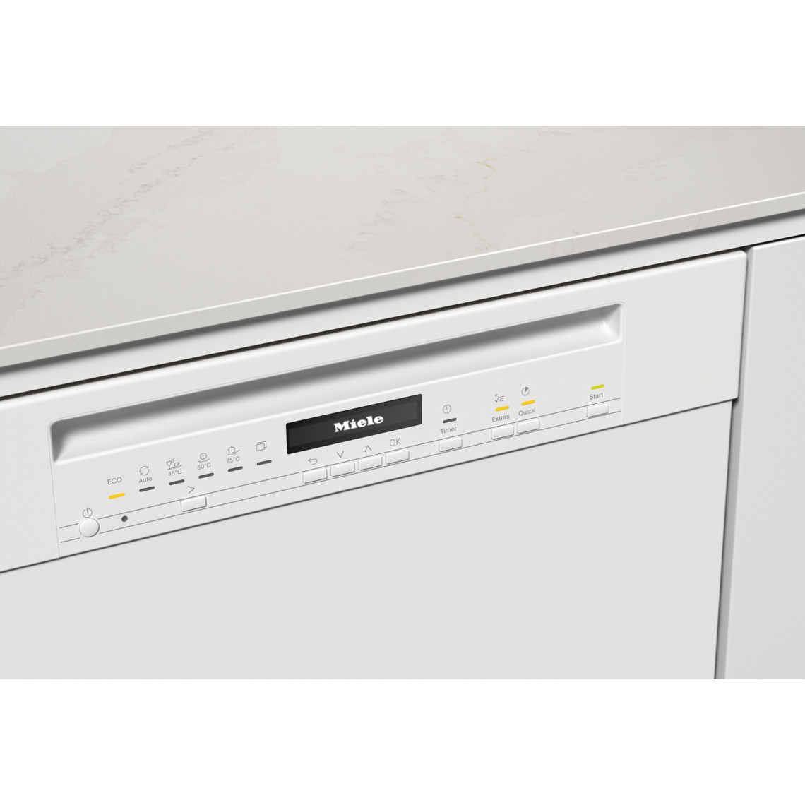 Erleben Sie die herausragende Leistung des Miele G 7210 SCU in elegantem Weiß. Dieser Unterbau-Geschirrspüler mit einer Breite von 60 cm und einer Höhe von 80,5 cm bietet Platz für bis zu 14 Maßgedecke, ideal für Haushalte mit 3-4 Personen.