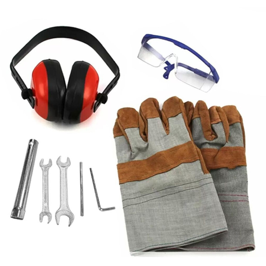 Im Lieferumfang erhalten Sie zusätzlich eine Vielzahl nützlicher Extras wie dicke Handschuhe, eine Schutzbrille, Lärmschutz-Kopfhörer, eine Plastikkanne und ein praktisches Werkzeugset.