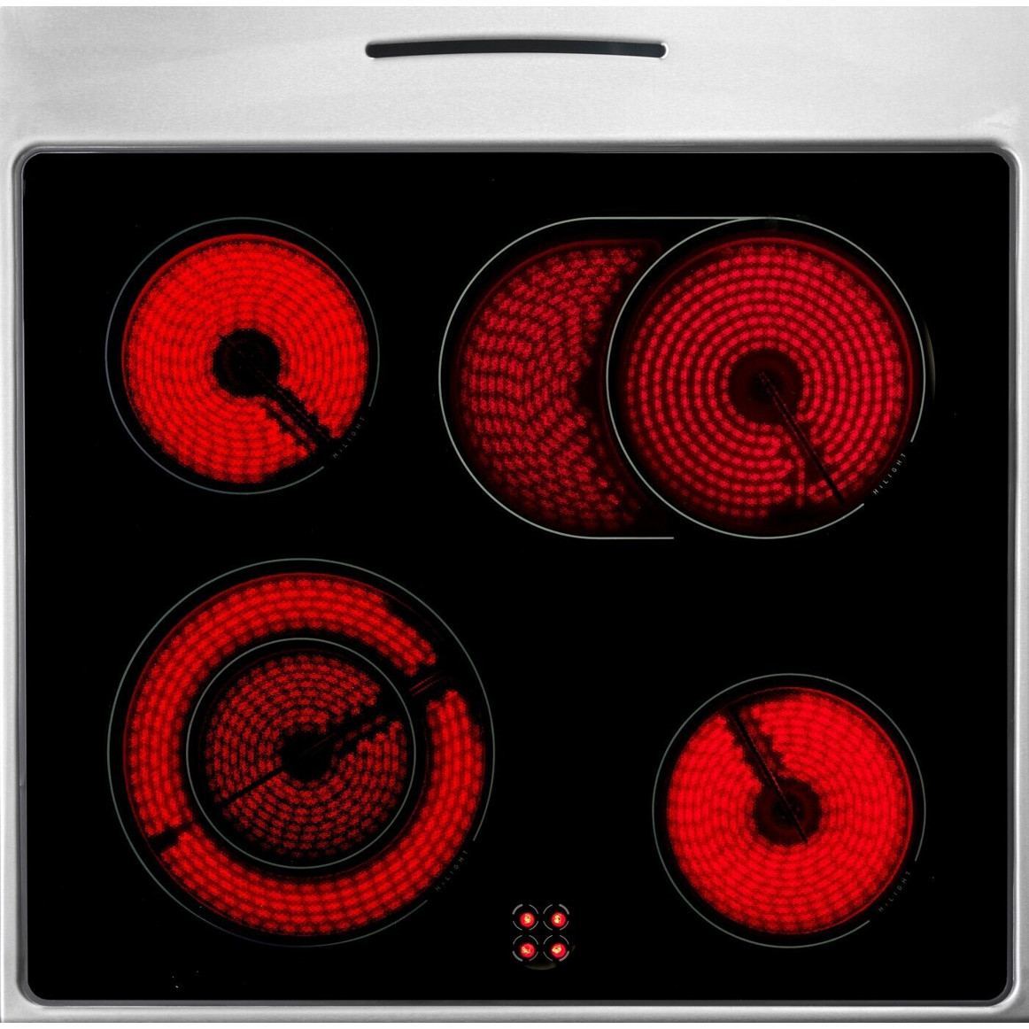 Dieses leistungsstarke Gerät verfügt über ein elektrisches Kochfeld mit insgesamt 4 Kochzonen, darunter eine praktische Bräterzone und zwei unterschiedliche Kochzonen für vielseitiges Kochen. Die Glaskeramik-Oberfläche sorgt nicht nur für eine einfache Reinigung, sondern auch für eine elegante Optik.