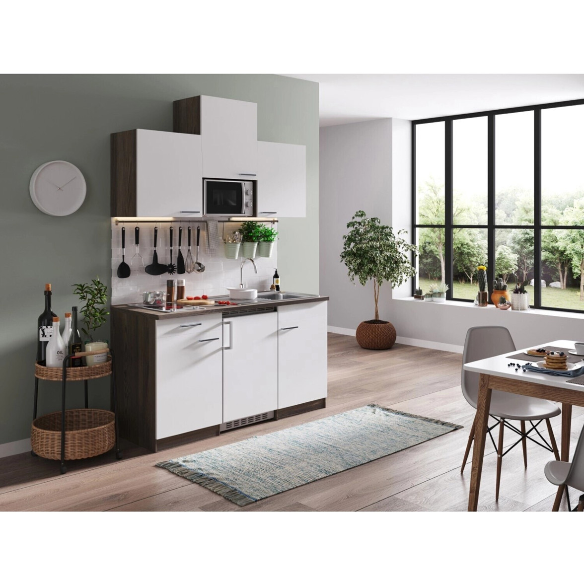 Die Ausstattung umfasst ein Kochfeld mit Restwärmeanzeige, eine leistungsstarke Mikrowelle, eine Edelstahlspüle, eine Schublade sowie eine praktische Ab- und Überlaufgarnitur. Genießen Sie die Flexibilität und den Komfort beim Kochen und Zubereiten Ihrer Speisen.