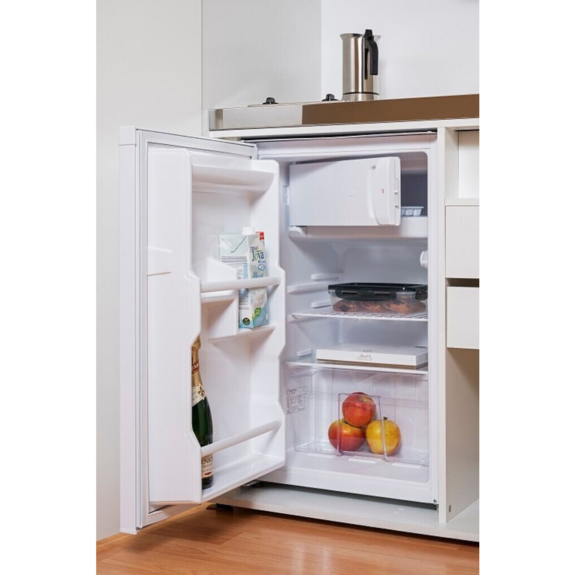 Die Schrankküche bietet eine geräumige Kühlzone mit einem Inhalt von 73 Litern und einem Gefrierbereich, der über 8 Liter Stauraum verfügt. So haben Sie genug Platz für all Ihre Lebensmittel. Durch die Energieeffizienzklasse F und einen Stromverbrauch von 121 kWh/Jahr ist sie zudem umweltfreundlicher als viele andere Geräte.
