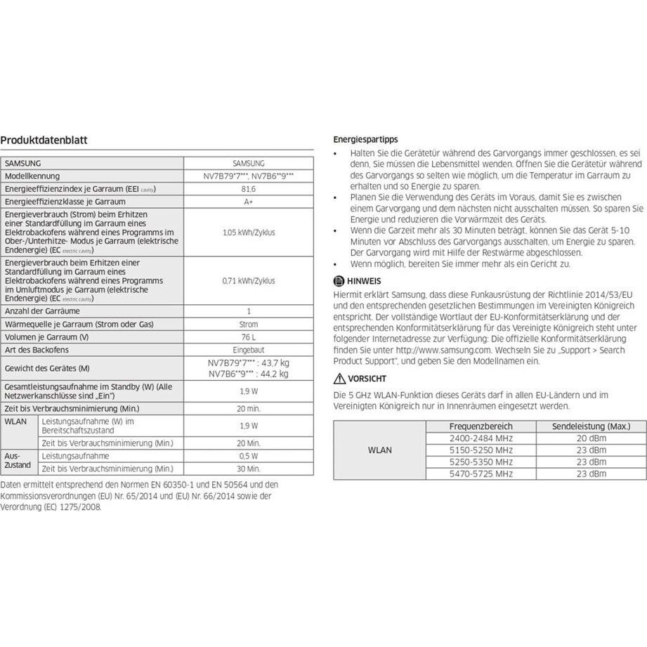 Mit einer Breite von 59,5 cm und einem Innenraum-Volumen von 76 Litern gehört der Samsung NV7B7997ADK/U1 zur Kategorie der großen Backöfen (über 65l). Er funktioniert mit einer Energieversorgung von 220 - 240 V und hat eine Netzabsicherung von 16 A. Der Energieverbrauch beträgt konventionell 1,05 kWh und mit Heißluft/Umluft nur 0,71 kWh.