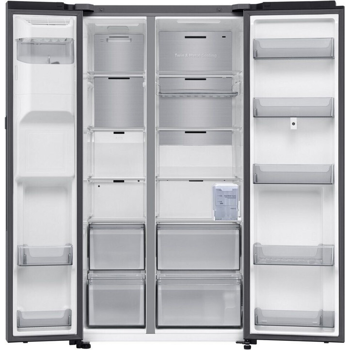 Entdecken Sie den Samsung RS90F67BETEF, Ihren neuen Partner in der Küche! Dieser freistehende Side-by-Side-Kühlschrank in elegantem Silber oder Grau bietet mit einem Gesamtvolumen von 614 Litern ausreichend Platz für die gesamte Familie.