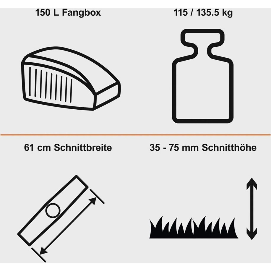 Mit einer Schnittbreite von 61 cm und einem Fangkorbvolumen von 150 Litern ist dieser Rasenmäher perfekt für große Flächen bis zu 5.000 m². Egal ob Sie das Gras auf maximaler Schnitthöhe von 75 mm oder mindestens 35 mm kürzen möchten, der Scheppach IX-BRT-610 bietet Ihnen die Flexibilität, die Sie benötigen.