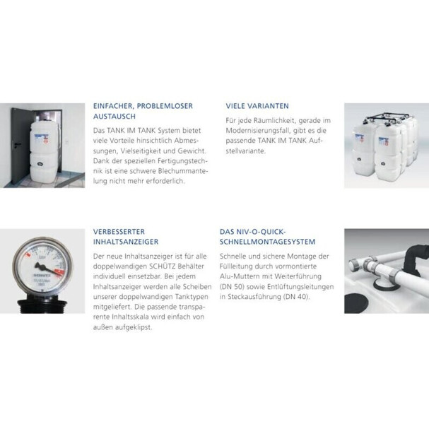 Die Schütz Logafix Serie bietet Ihnen ein Tank-in-Tank-System, das sich durch seinen offenen, drucklosen Bau auszeichnet. Der Innenbehälter ist mit einer speziellen Auffangwanne aus Polyethylen ausgestattet, die zusätzlich eine Geruchsbarriere (SMP) beinhaltet, um das Entweichen von Ölgerüchen zu vermeiden. Dies sorgt nicht nur für eine saubere Umgebung, sondern auch für eine sichere Lagerung.
