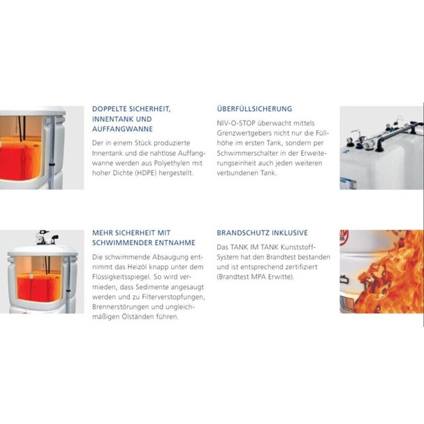 | Bemerkung: | Tank-in-Tank-System / Innenbehälter mit Auffangwanne aus Polyethylen / mit Geruchsbarierre SMP gegen austretenden Ölgeruch / ausschließlich zur drucklosen Lagerung von Heizöl |