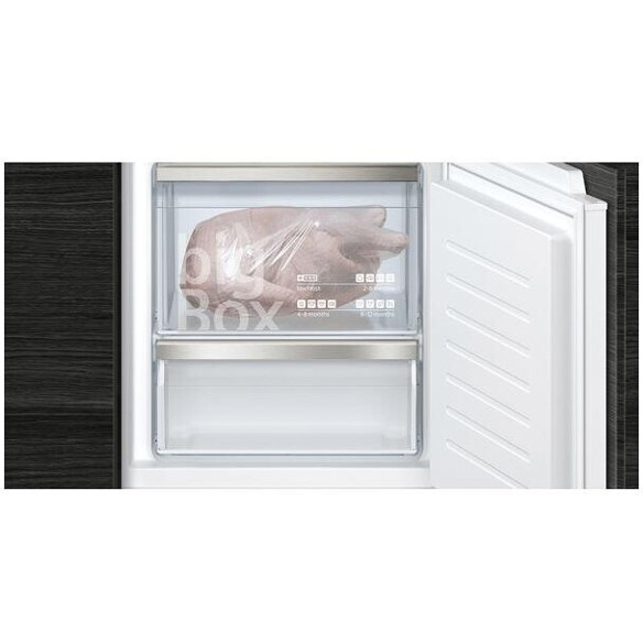Der integrierbare Einbaukühlschrank hat eine Höhe von 177,5 cm und eine Breite von 55,8 cm, perfekt geeignet für Familien mit einem Inhalt Kühlbereich von 208 Litern und einem Inhalt Gefrierbereich von 62 Litern. Mit 5 Abstellflächen und verschiedenen Innenraum-Ausstattungen wie der 0-Grad-Zone, Eiswürfelschale und einer Big Box bleibt alles ordentlich und leicht zugänglich.