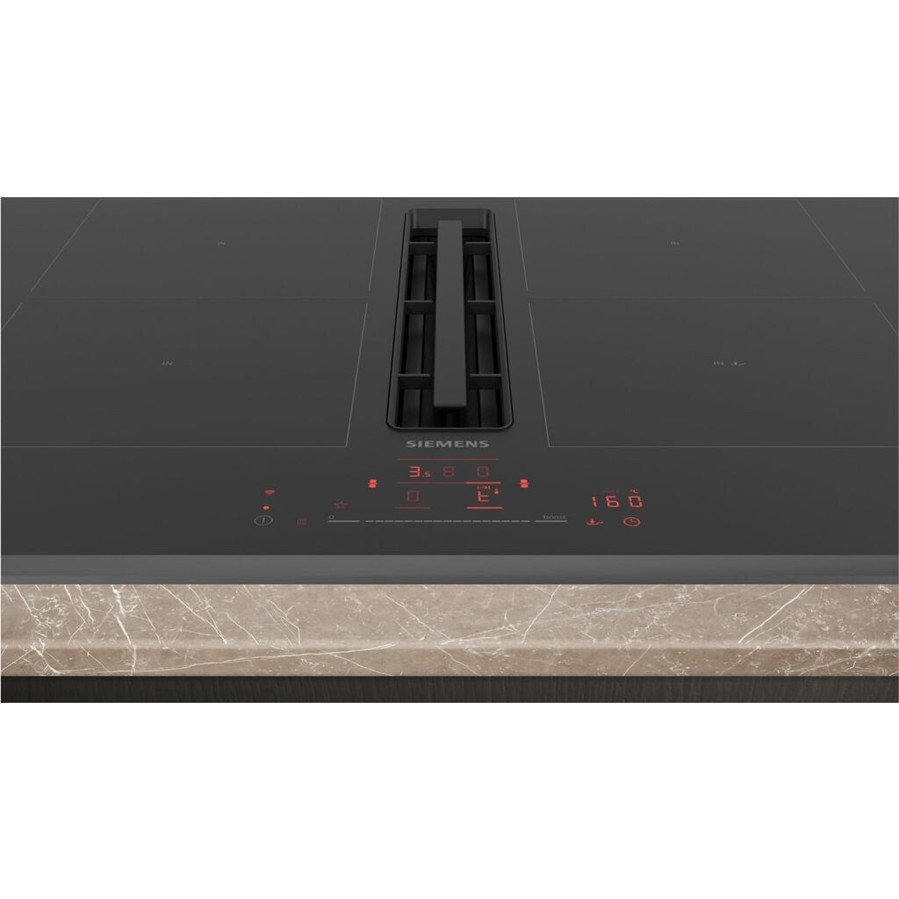 Die hochwertigen Materialien wie Glaskeramik verleihen dem Kochfeld nicht nur eine ansprechende Optik, sondern auch eine erhöhte Robustheit. Dank der speziellen Konstruktion ohne Rahmen und der mittig liegenden Abzugshaube fügt sich die Siemens ED851HQ26M nahtlos in Ihre Küche ein.