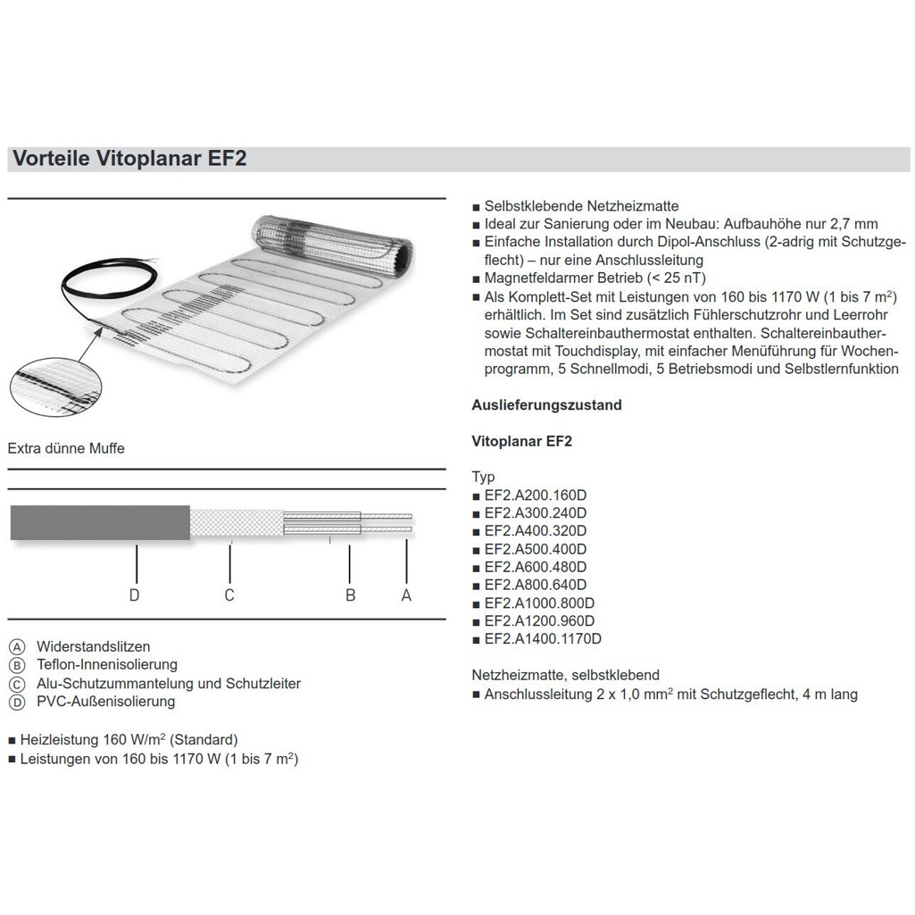 Die Viessmann EF2 erreicht eine maximale Betriebstemperatur von 90 °C und bietet bei einer Leistung von 160 Watt/m² ein angenehmes Wohlfühlambiente. Mit einer Breite von 0,5 m und einer Länge von 14 m passt sich diese Fußbodenheizung optimal Ihren Bedürfnissen an und hat eine geringfügige Aufbauhöhe von nur 2,7 mm.