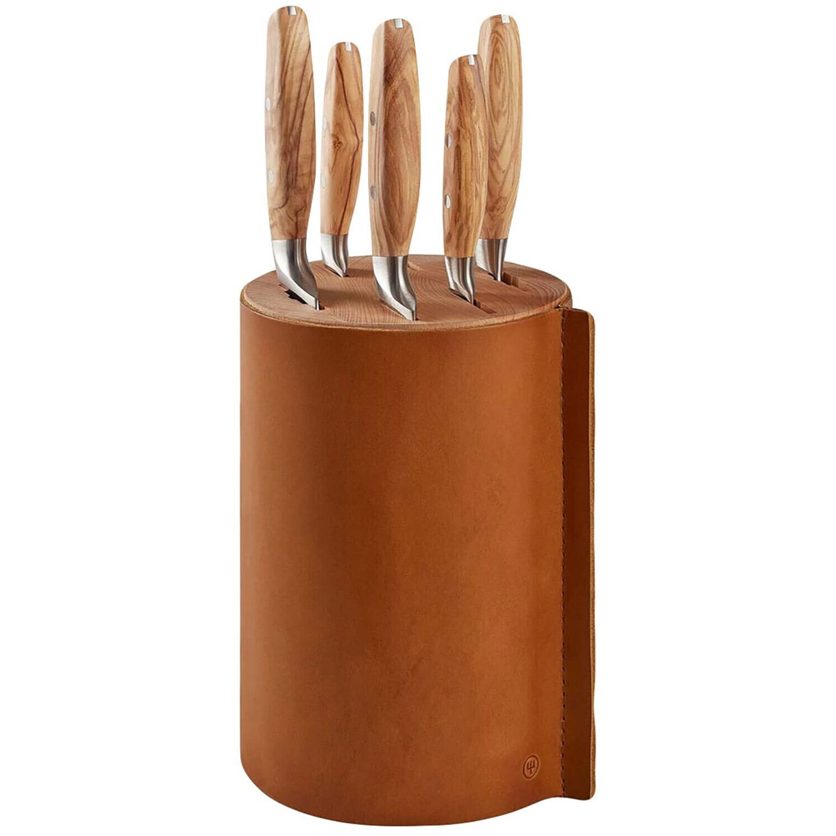 Entdecken Sie das perfekte Küchenwerkzeug mit dem Wüsthof Amici Messerset, das aus fünf hochwertigen Messern in einem eleganten Messerblock besteht. Die braune Farbe des Blocks harmoniert perfekt mit dem Olivenholz-Griff, der nicht nur stilvoll aussieht, sondern auch exzellent in der Hand liegt.