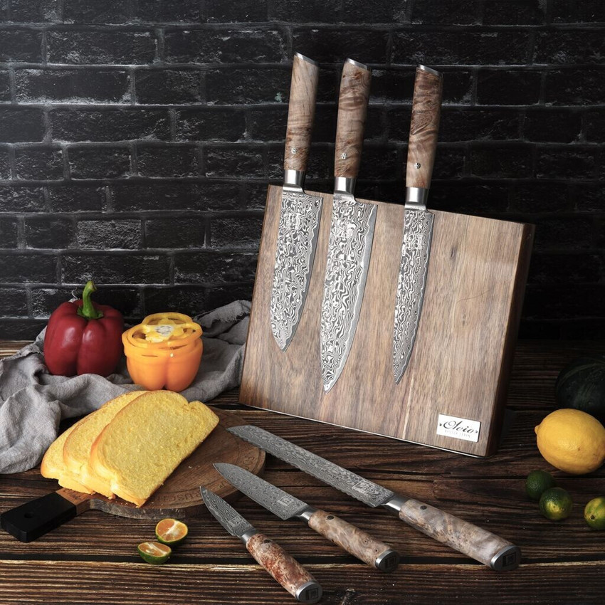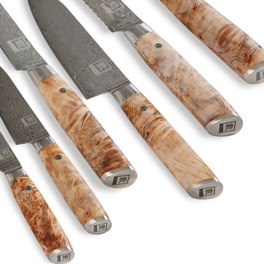 Die Klingen aus hochwertigem Material garantieren nicht nur eine herausragende Schnitthaltigkeit, sondern verleihen auch eine elegante Ästhetik. Die Griffe sind aus edlem Wurzelholz gefertigt, was nicht nur für einen sicheren und bequemen Halt sorgt, sondern auch eine außergewöhnliche Optik bietet.